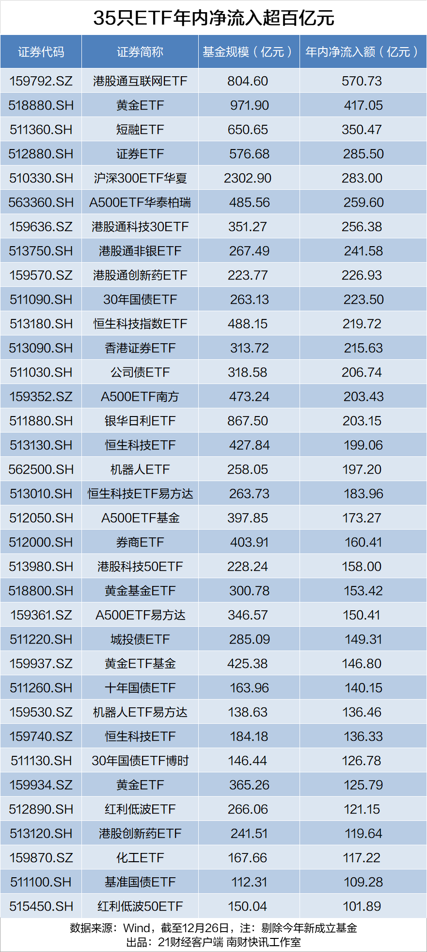 年内资金流向揭示出清晰的配置主线。35只ETF年内净流入超百亿元,在净流入额排名前十的ETF中,港股通互联网ETF(159792.SZ)以年内570.73亿元的净流入额成“吸金王”,其基金规模达到804.6亿元,年内规模增加583.73亿元,显示出资金对港股科技龙头的持续看好。