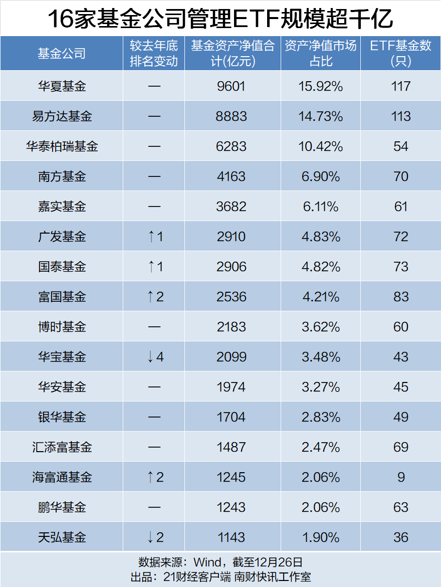 座次也出现调整。华夏、易方达、华泰柏瑞、南方、嘉实仍占据前五;广发从第七升至第六,国泰从第八升至第七,富国从第十升至第八,华宝则从第六掉队至第十。