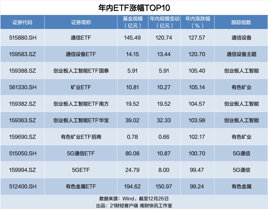 从业绩表现看,ETF年内涨幅榜单清晰勾勒出科技革命与实物资产重估两条主线。年内8只ETF涨幅翻倍,在涨幅排名前十的ETF中,通信与人工智能相关ETF包揽七席,通信ETF(515880.SH)与通信设备ETF(159583.SZ)涨幅双双突破120%,三只跟踪创业板人工智能指数的ETF产品涨幅均超100%。这背后是AI算力基建加速落地、自主可控芯片技术突破、人形机器人产能释放等产业红利的集中兑现。