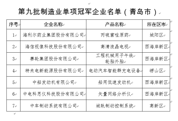 此次入选企业分别为海利尔药业、海信视像、赛轮集团、特来电、中船发动机、中电科思仪、中车制动等,分布于新型显示、橡胶轮胎、新能源、仪器仪表、船舶海工、轨道交通装备等领域。