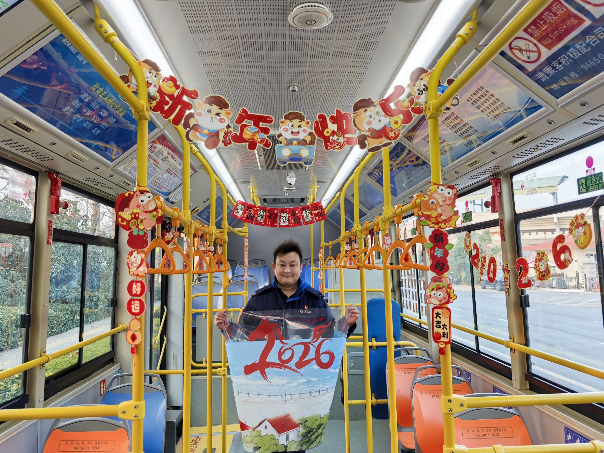 被誉为“最美公交线”的317路,沿途串起前海一线的亮丽风光。从第三海水浴场的晨光微澜,到小麦岛公园的静谧安详,再到石老人海水浴场的壮阔波澜,每一程都是迎接新年第一缕阳光的绝佳窗口。步入车厢,映入眼帘的依然是浓浓的年味——喜庆的拉花、寓意美好的挂件,这些装饰不仅烘托节日气氛,更寄托着对乘客新年出行平安、万事顺遂的诚挚祝福。