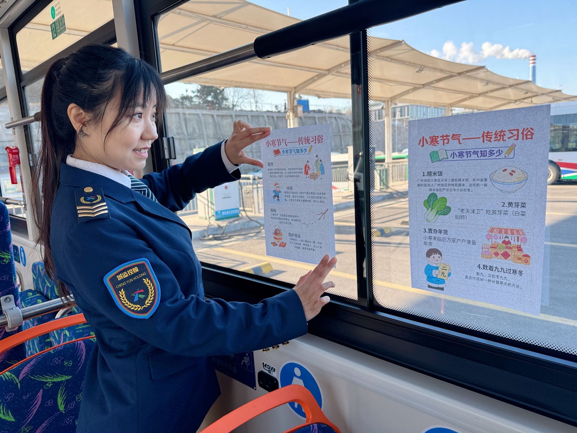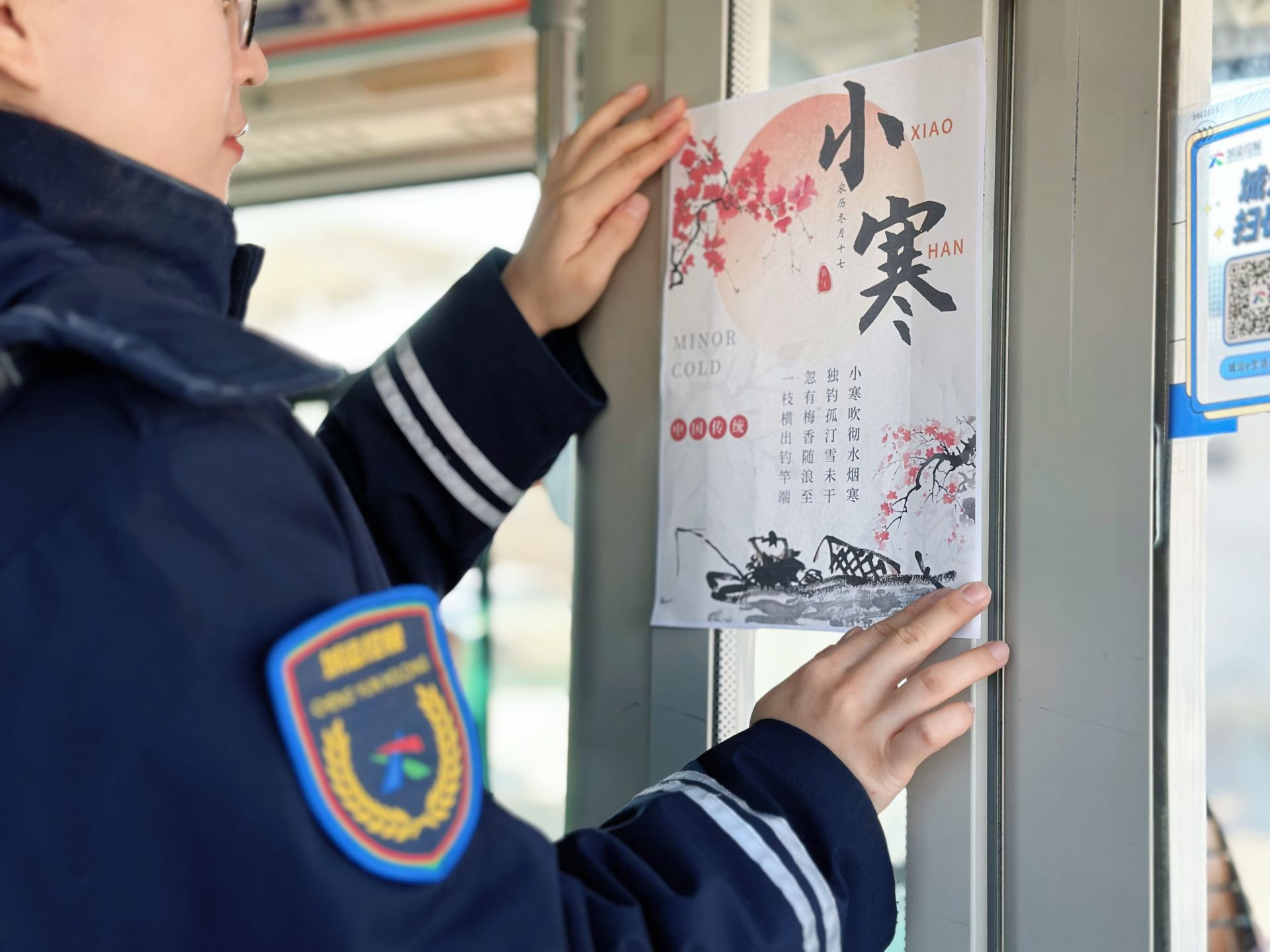 5日上午,步入612路、626路、643路、隧道8路等公交车厢,一幅幅图文并茂的海报吸引了众多乘客的目光。“一九二九不出手,三九四九冰上走”等民俗谚语朗朗上口,小寒的气候特点、传统习俗及相关古诗词等内容清晰呈现,构成了一幅充满人文气息的流动文化长廊。乘客周女士点赞道:“内容既丰富又贴近生活,坐在车上就能感受到浓厚的节气氛围,温馨巴士真的很用心。”