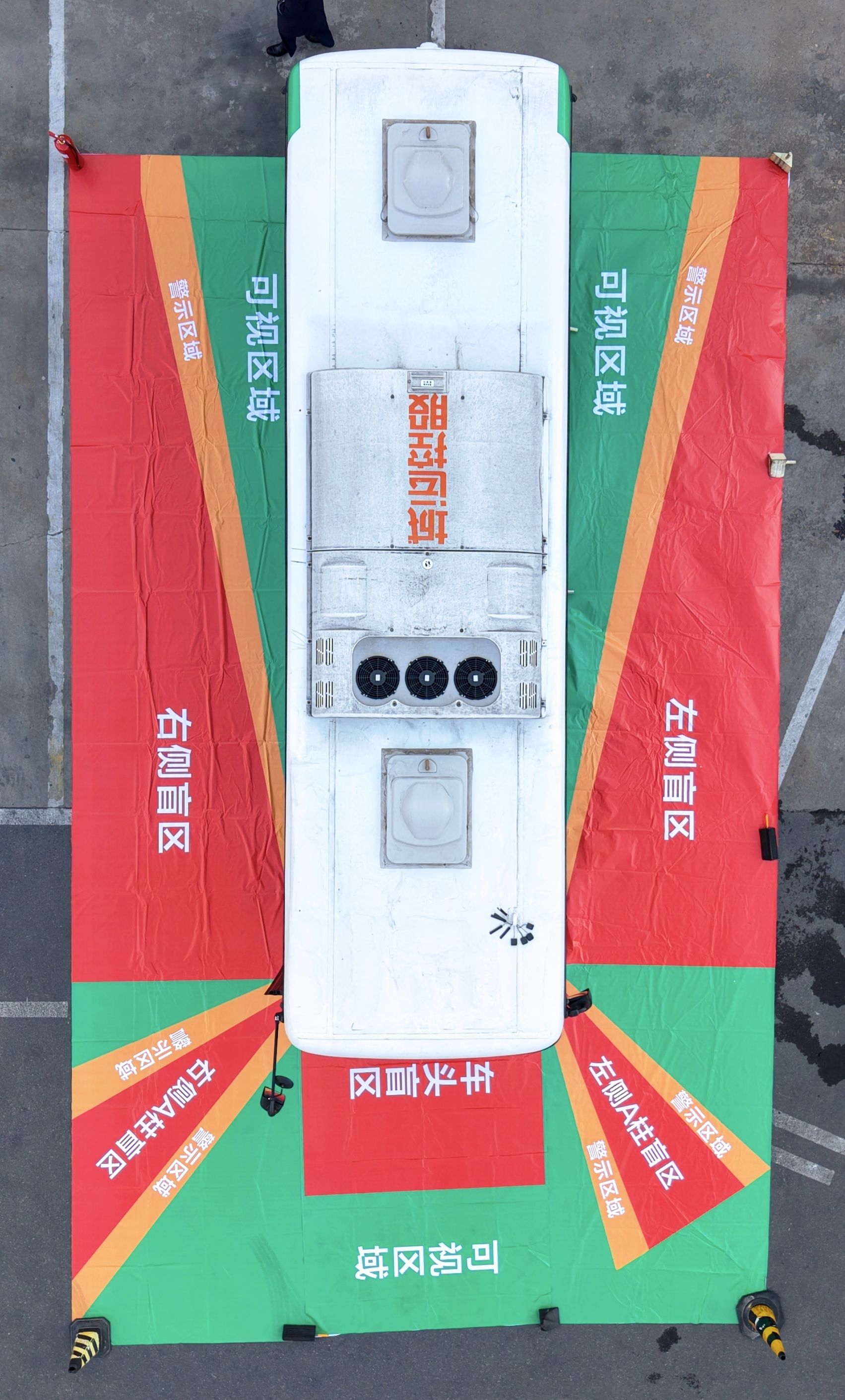 为突破这一瓶颈,市南巴士公司自主设计并制作了一套与实车比例完全一致的盲区示意地垫。该地垫可灵活铺设在公交车四周,通过醒目的颜色区分不同区域:绿色代表驾驶员可直接观察到的可视区域;黄色为警示区域,提示驾驶员有车辆或行人进入时需高度警惕;红色则标识出关键盲区,涵盖车头盲区、左右侧车身盲区及A柱盲区等视线死角。