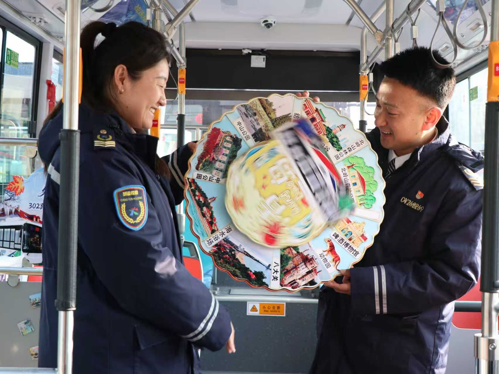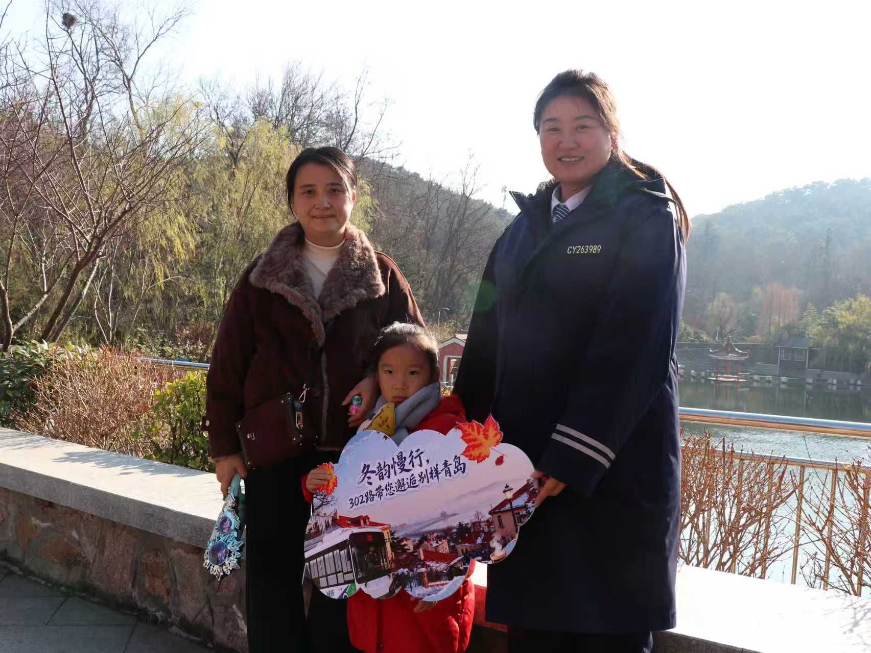 为进一步提升乘客体验,302路车厢内还贴心配备了保暖坐垫、暖宝宝、矿泉水、纸巾等便民物品,让每一位乘客从上车便能感受到细致入微的温暖服务。车辆每到一处景点,乘客们有序下车游览、拍照打卡。302路线还制作了主题冰箱贴送给当天同行的乘客,车厢内外洋溢着轻松愉快的氛围。
