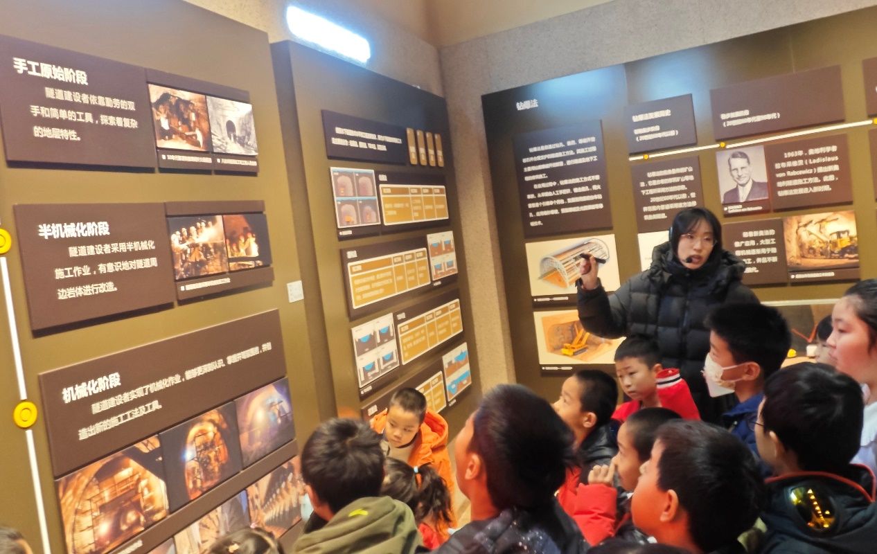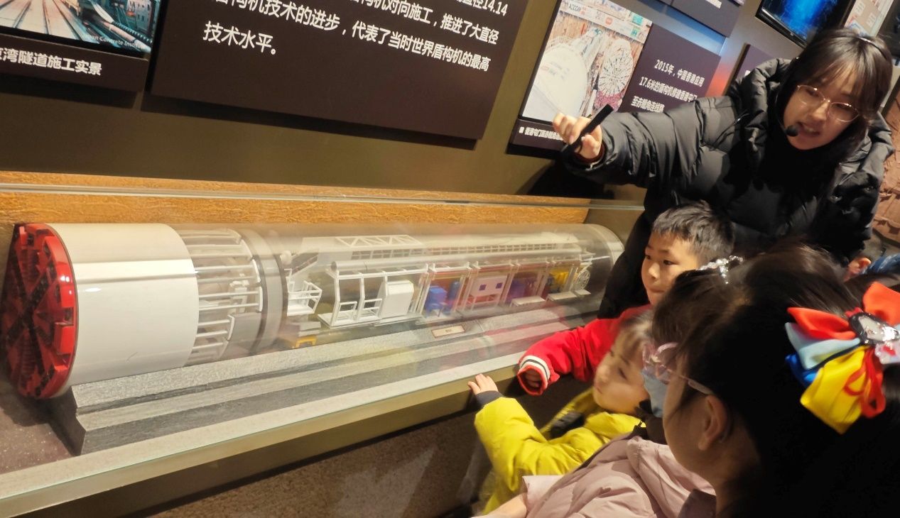 博物馆的讲解员老师刘书华带领小记者开启探索之旅。在世界海底隧道大观展区,墙上的时间轴清晰梳理了海底隧道的发展及科研历史,展板系统展示着国内外已建、在建海底隧道的核心数据。