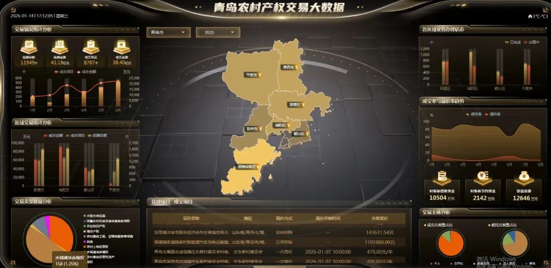 单宗交易额最大项目:2025年12月18日,青岛西海岸新区长江中路商场出租项目顺利成交,总交易额达2.45亿元,成为青岛市农村产权流转交易中单笔交易额最大的项目。该项目总面积52651平方米,位于长江路街道焦家庄社区,由该村集体经济组织所属庐山实业公司运营,流转期限10年。