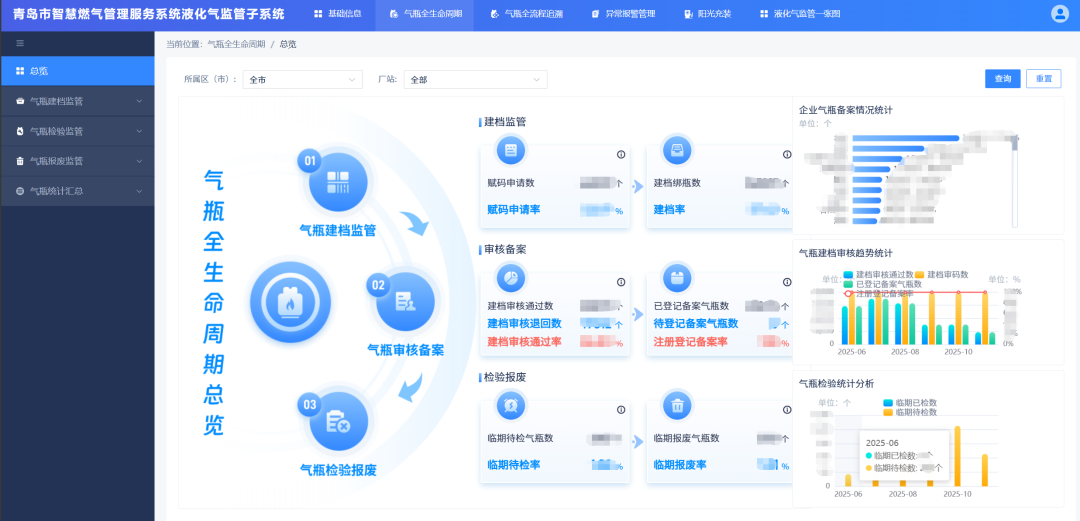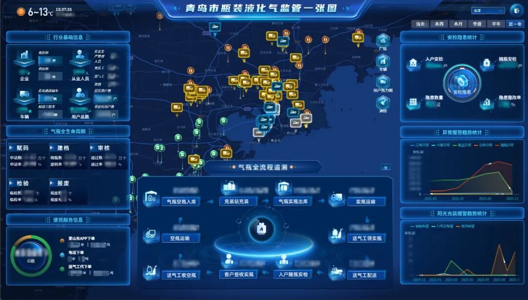 海纳云针对青岛瓶装液化气行业特点,创新构建“全生命周期+全流程追溯”融合管理模式。为青岛量身打造的瓶装液化气监管一张图率先打通城市管理、市场监管、交通运输等多部门及数十家液化气企业业务系统,实现企业、气瓶、人员、车辆等各维度数据实时汇聚,构建行业基础信息“一本账”,让青岛市液化气行业基础信息准确率提升至99.9%,跨部门协同监管效率大幅提升。
