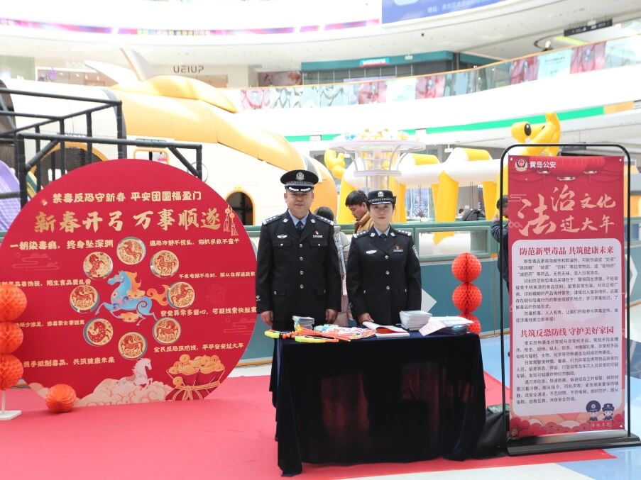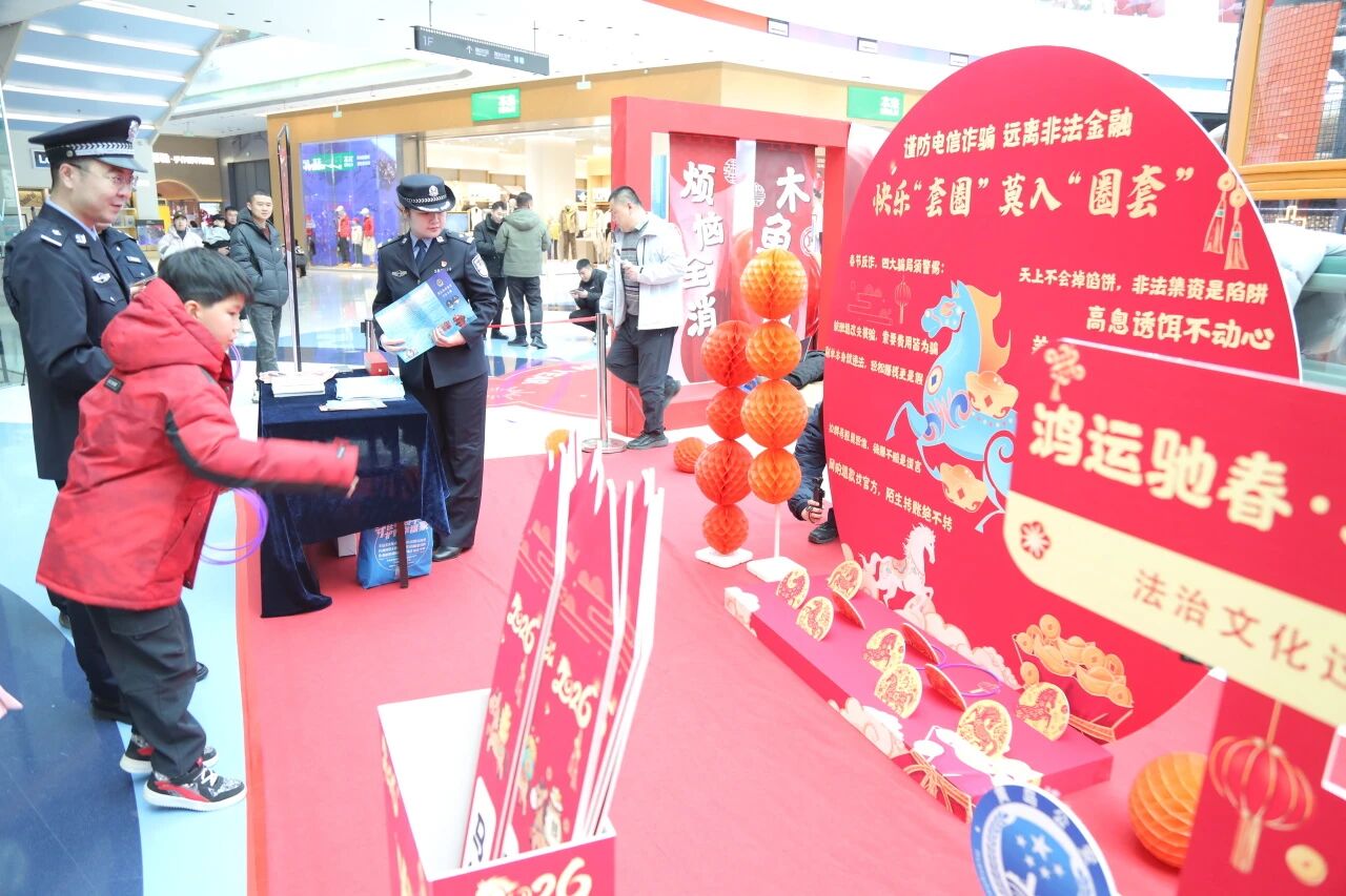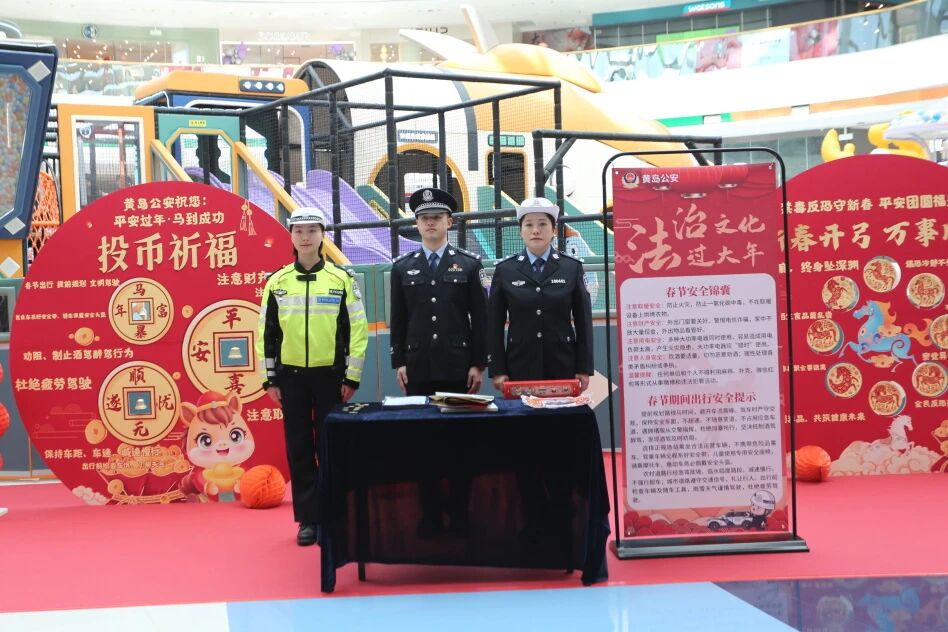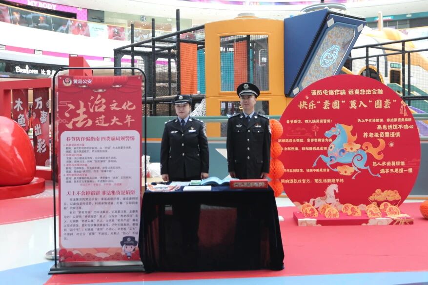 2月6日,青岛市公安局黄岛分局在西海岸新区融创茂开展“法治文化过大年”主题宣传活动,10余名民警重点围绕春节期间安全出行、居家安全、公共秩序、禁毒、反恐、防范电信网络诈骗及非法金融等领域进行普法宣传。记者在现场看到,该活动将普法内容巧妙地融入各个互动游戏中,在娱乐中将“法治年货”送到市民手中,为即将到来的新春佳节增添了浓厚的法治氛围。