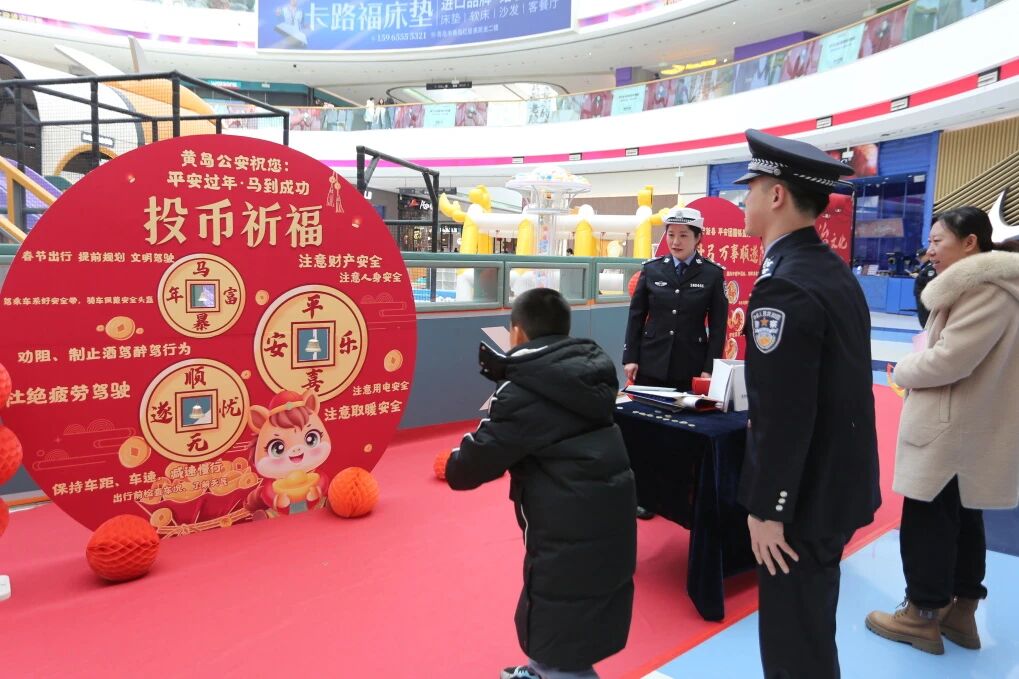 活动现场,黄岛公安深化“交所融合”工作机制,统筹派出所与交管民警协同发力,紧扣春节期间安全防护核心,将春节安全注意事项、烟花爆竹燃放规范、出行安全准则、交通违法警示及基础法治知识,巧妙融入“投币祈福”游戏环节。