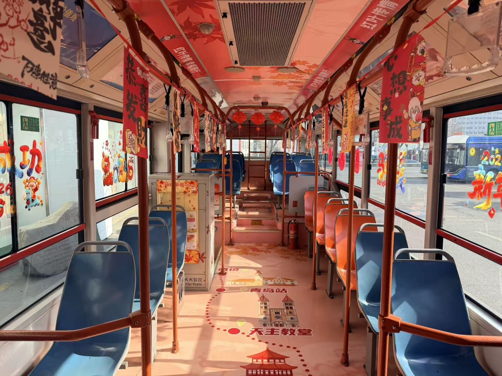 新春临近,年味渐浓。2月7日,青岛城运控股公交集团市北巴士第一分公司精心打造了马年新春主题车厢,把“2026马年大吉”“好事连连”等吉祥元素融入十米车厢之中,使得行驶在岛城街巷的公交车变成了流动的“新春福站”,给市民出行增添了许多暖意和喜庆气氛。