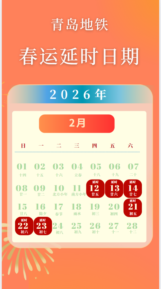 为全力保障春运旅途便捷顺畅,2月12—14日(腊月二十五至二十七,共3天)、2月21—23日(正月初五至初七,共3天),青岛地铁1、3号线首车时间提前、末车时间延后,同时8号线将在早间05:20及夜间23:00各增开直达列车1列。