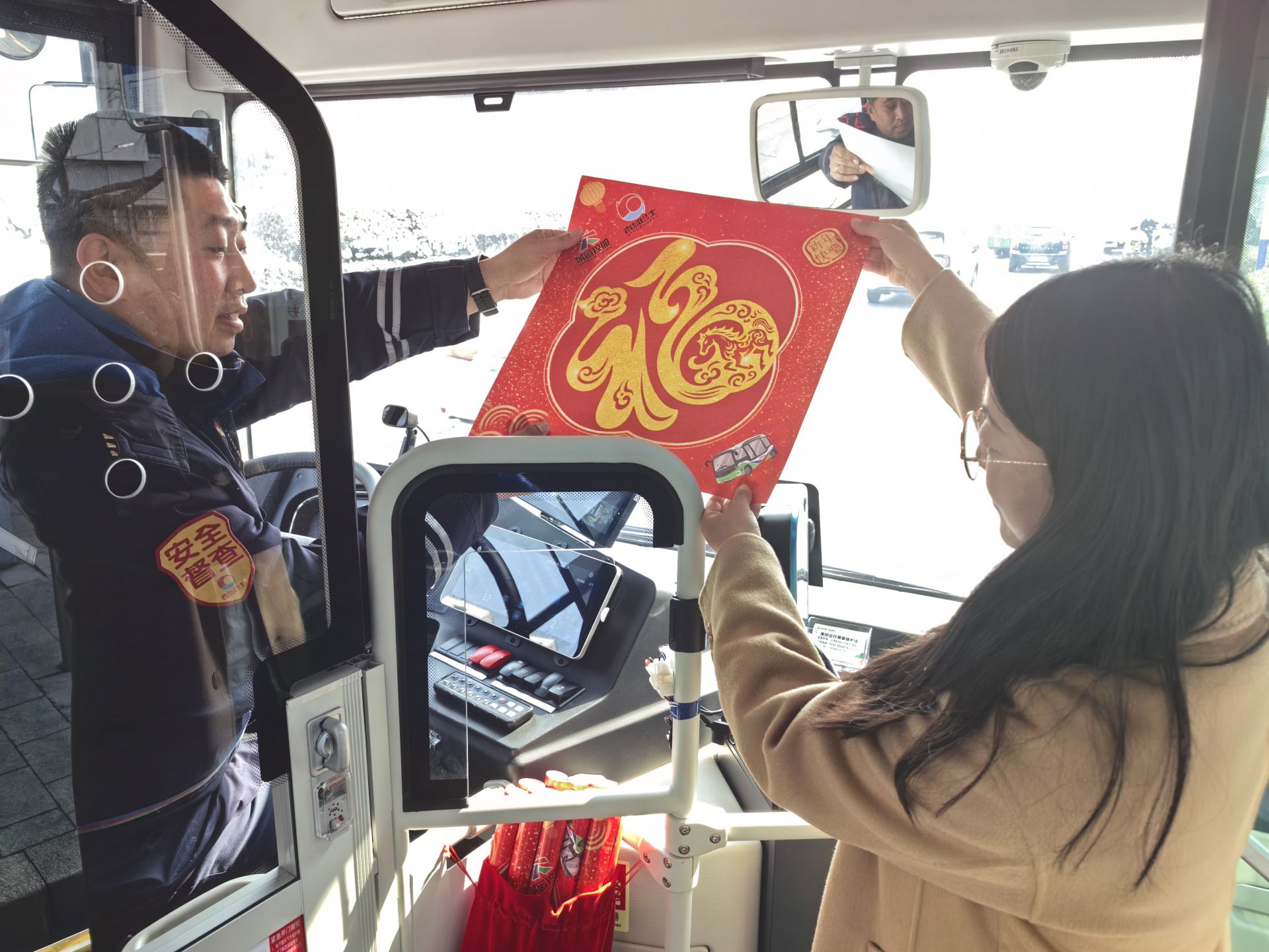 除了精心布置的节日装饰,这趟公交车还设置了互动打卡环节。乘客只需在车内拍摄照片或视频,附上新年祝福并带上话题“#乘314路打卡攒福气#”发布至任意社交平台,即可向驾驶员领取一张由崂山巴士公司特别定制的“福”字贴纸,将新年的好运气带回家。