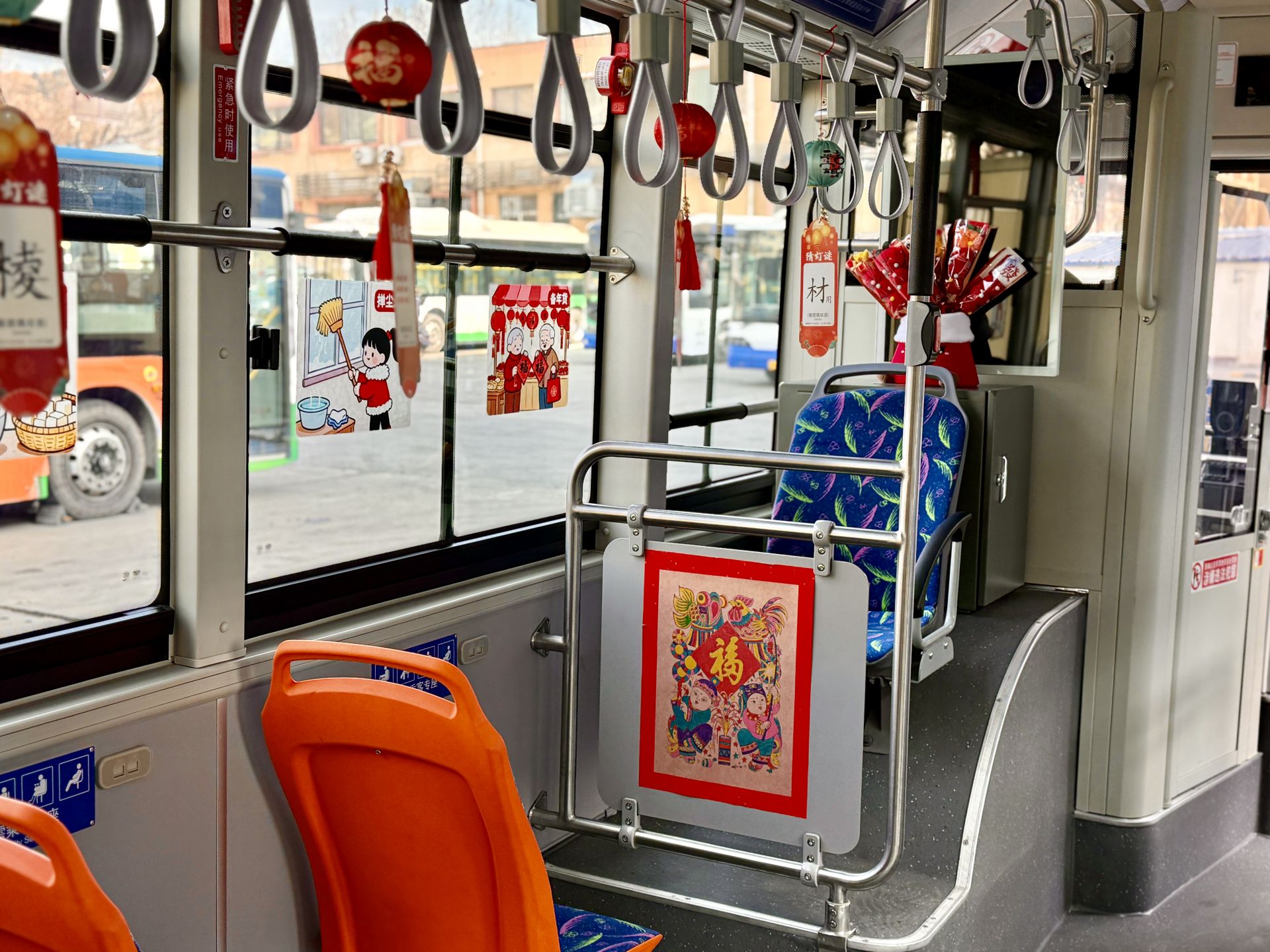 步入115路DD2527号车,记者便被浓厚的“年味”给紧紧包裹:五颜六色的灯笼悬挂在了上方扶手杆处,车厢内贴满年画,传统韵味十足。