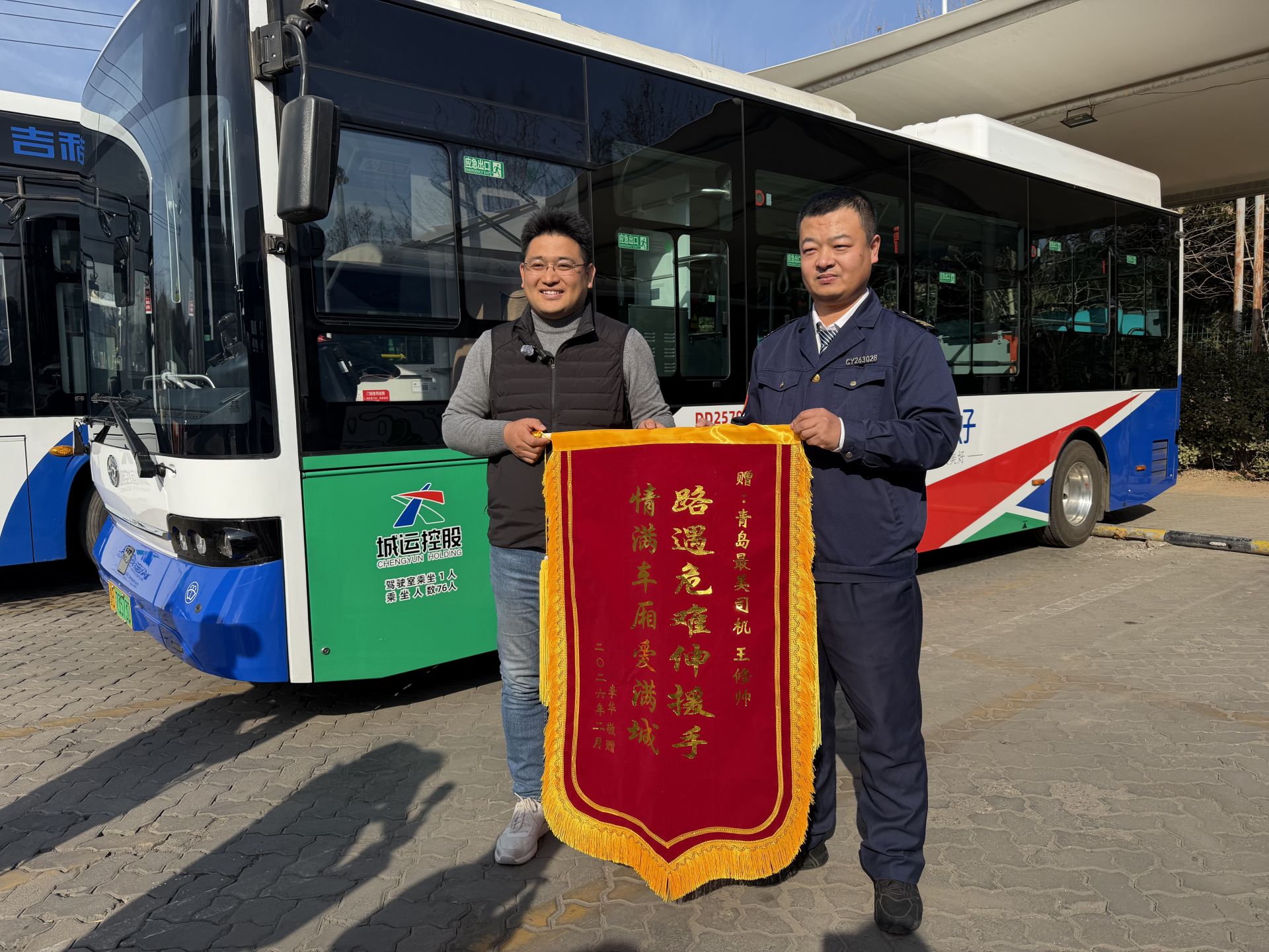 “王师傅,多亏您当时果断出手,我姐姐才能及时得救,这份恩情我们全家铭记在心!”2月9日10时许,青岛城运控股公交集团李沧巴士公司世博园公交场站内温情涌动。市民李先生手持鲜花与锦旗,带着一封感谢信,向驾驶员王修帅连声道谢。锦旗上“路遇危难伸援手 情满车厢爱满城”的字样,映照着一段发生在寒冬里的暖心救援故事。