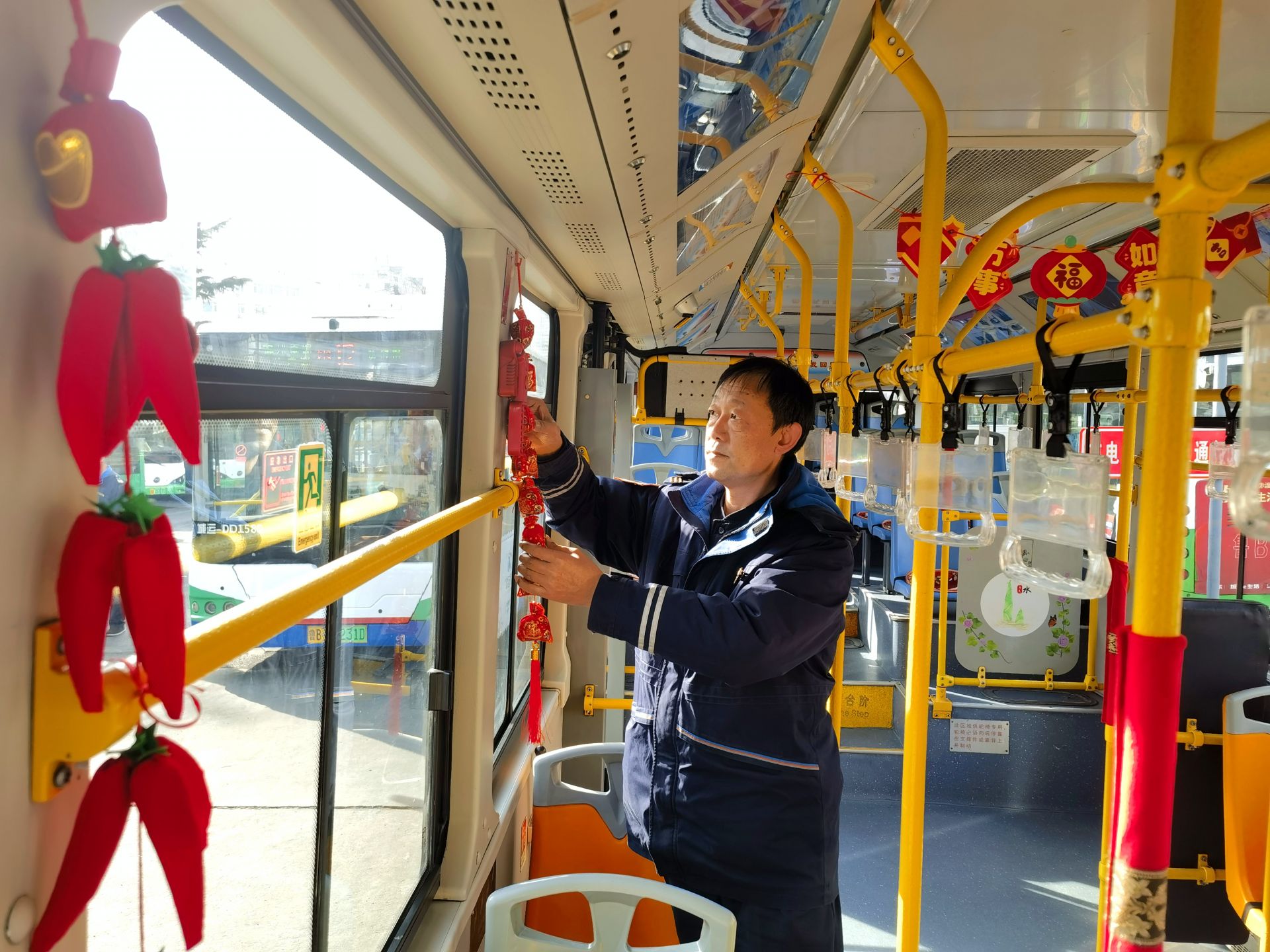 走进李滨驾驶的12路公交车,浓浓的年味扑面而来。车厢顶部悬挂着一串串精美的红色福袋和红辣椒挂件,寓意着“福气满满”“红红火火”。车厢中部,“万事如意”字样的拉旗装饰格外醒目,整个车厢洋溢着温馨热闹的节日气息。