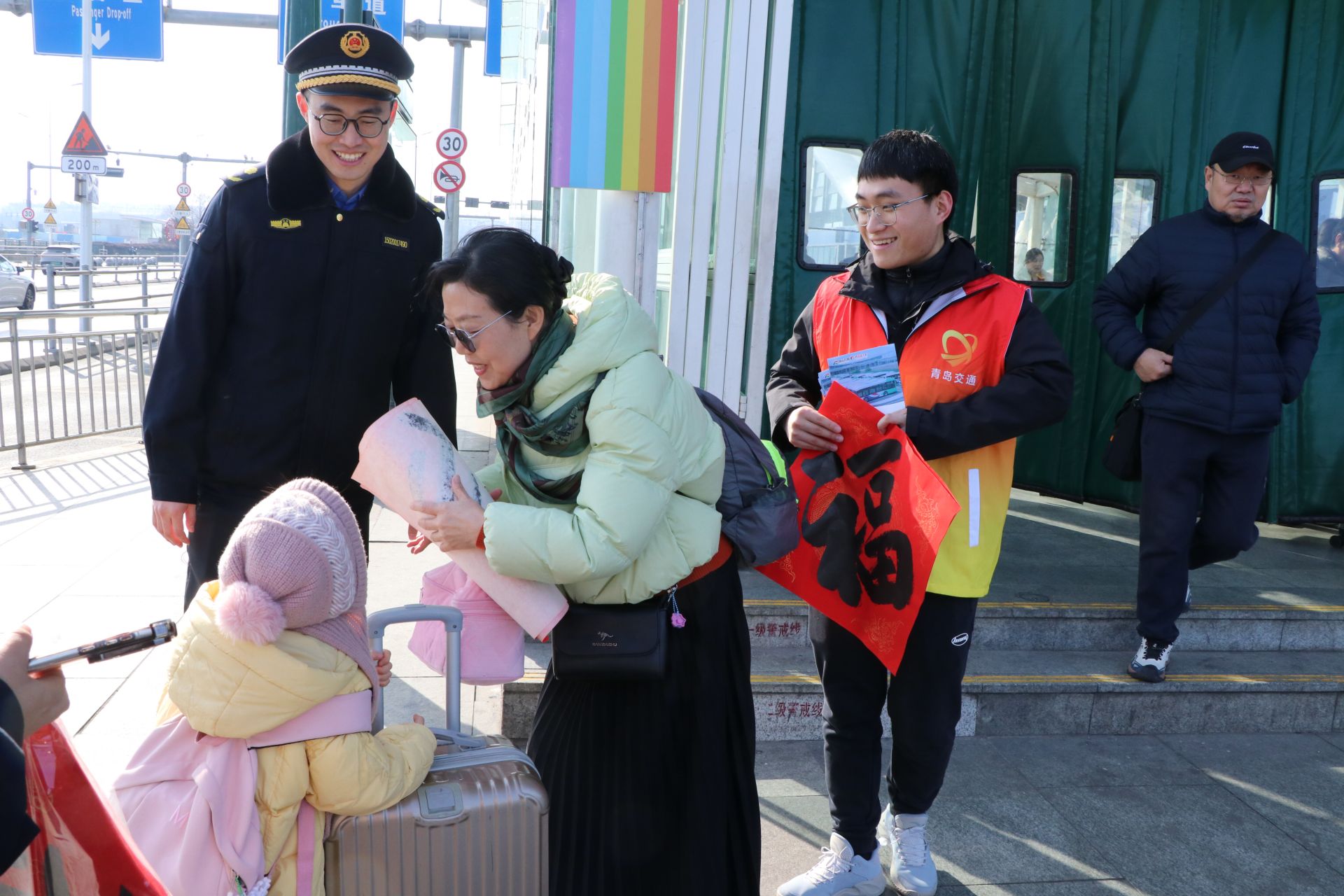 记者发现,活动现场还设有“福气留影”互动环节,不少旅客接过福字后,欣然邀请志愿者合影,记录旅途中的温暖瞬间。“一下车就收到福字,青岛的服务真暖心!”几位来青探亲的乘客连连道谢。一位带着孩子的女士也笑着称赞:“志愿者不仅送福,还帮忙照看孩子,太感谢了!”