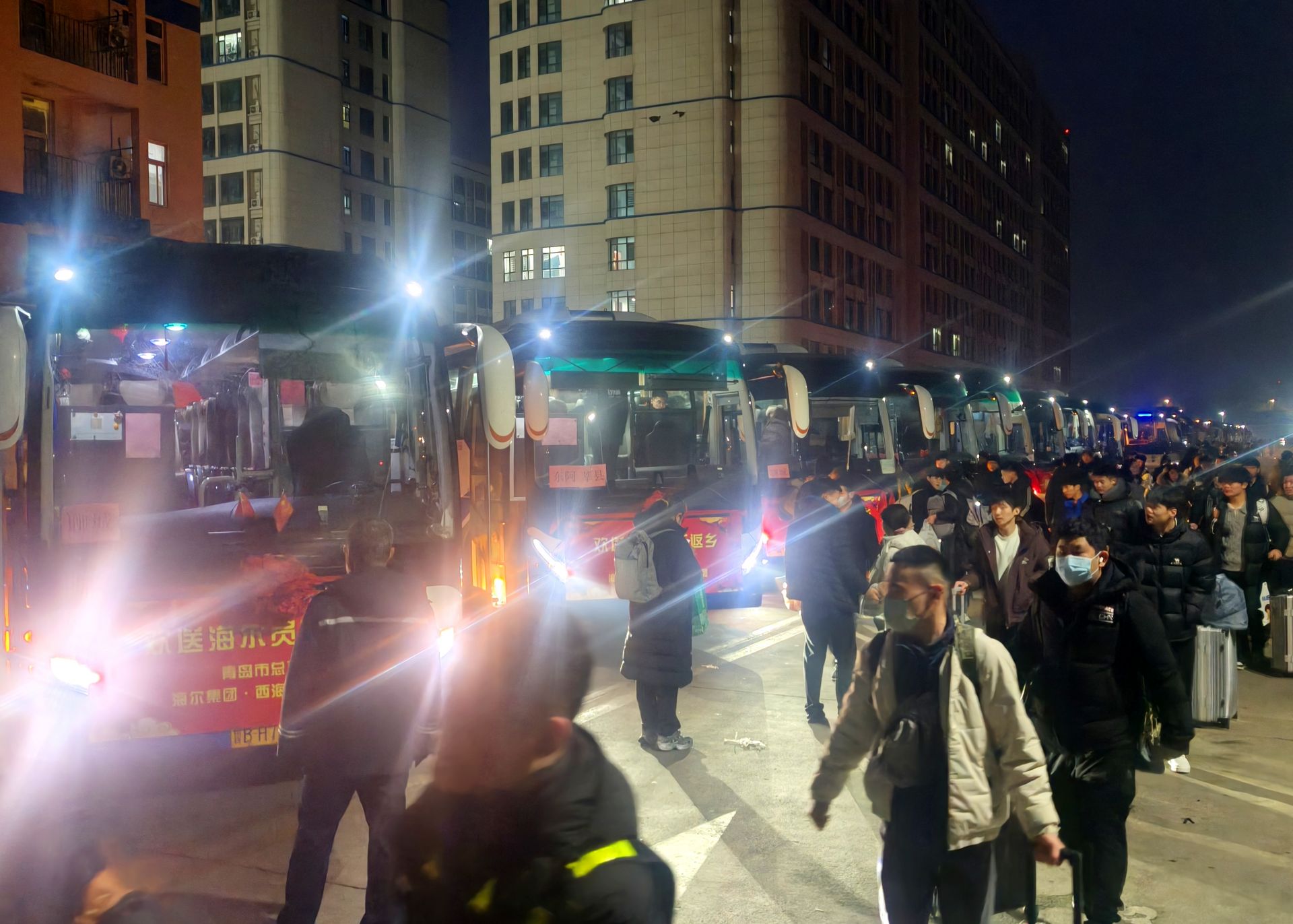 2月11日清晨,在海尔集团西海岸工业园,65辆“诚载美好”大巴整齐停放。驾驶员们再次认真检查车辆安全状况,细致清理车内卫生,确保车容车貌整洁、设备运行正常。现场工作人员早早到位,引导职工排队、登车,协助搬运大件行李、进行信息核对,并随车赠送新年“福”字,将新春祝福伴随返乡旅途。一句句“路上平安”“新年快乐”的问候,让返乡氛围格外温暖。