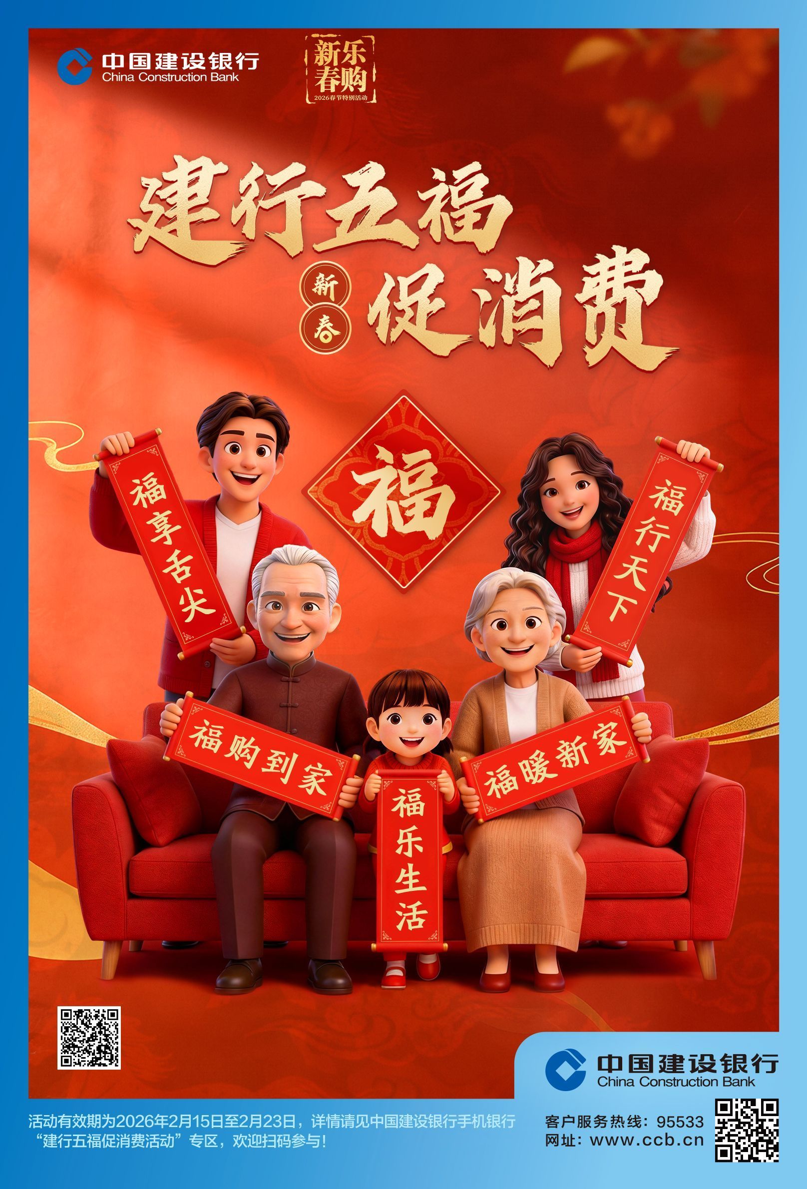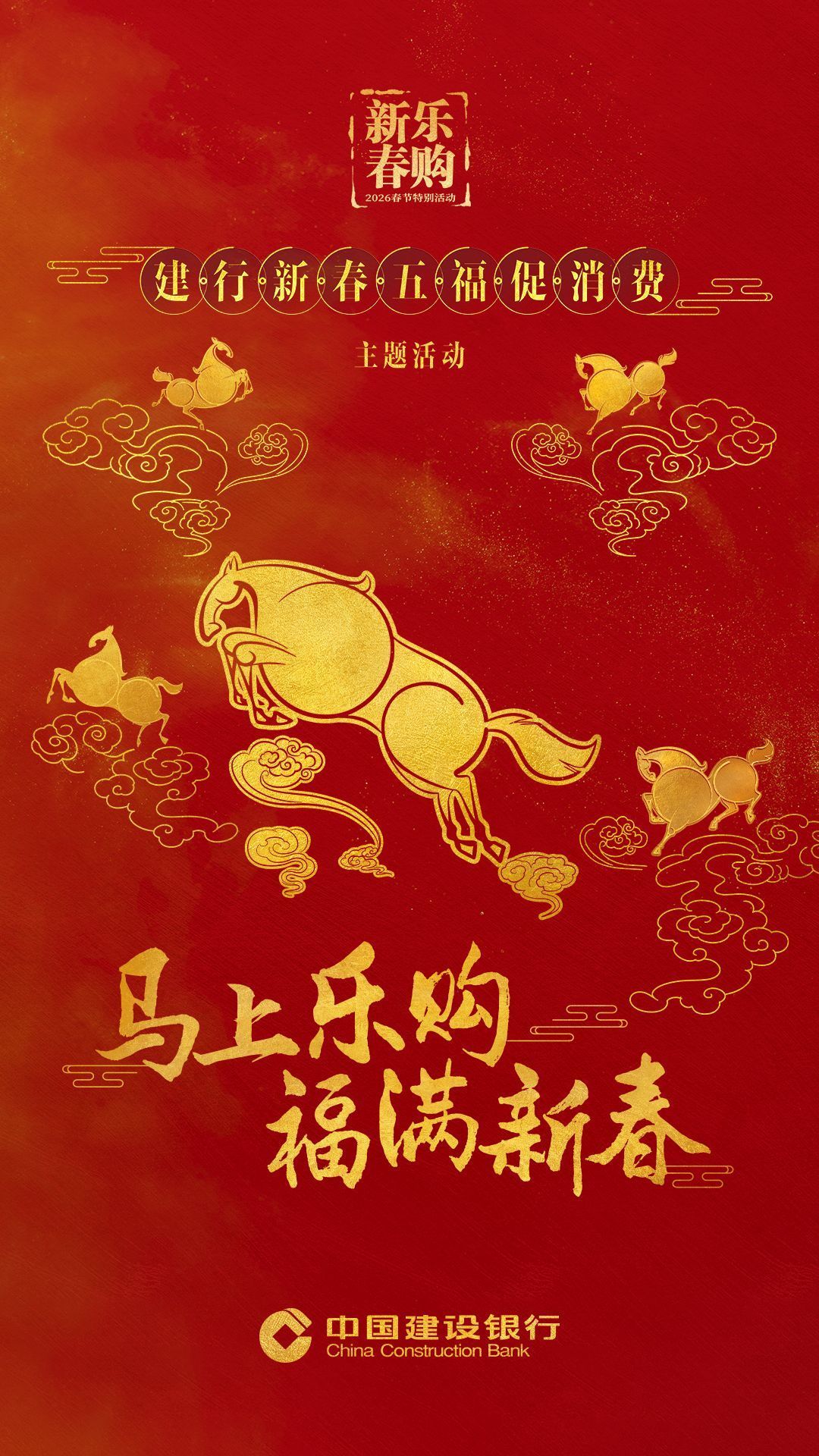 近日,建设银行积极响应商务部等九部委2026“乐购新春”春节特别活动号召,启动2026年春节促消费专项活动,紧密围绕人民群众“好吃、好住、好行、好游、好购、好玩”核心需求,以“福享舌尖、福暖新家、福行天下、福购到家、福乐生活”为主题,精心策划开展15项惠民活动,并集中推出微信立减金、消费券、数字人民币智能合约红包、支付满减、利率优惠等多重权益,助力实现马年消费“开门红”。