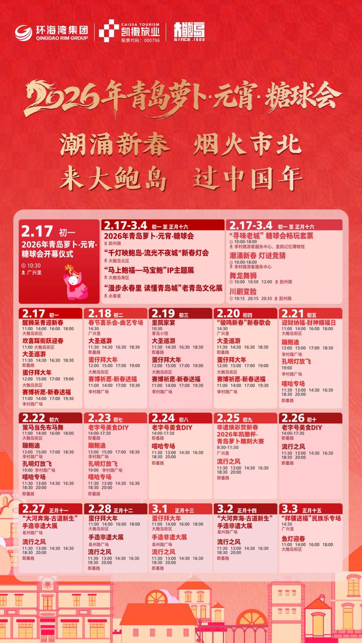 2月17日(正月初一)上午10:30,2026年青岛萝卜·元宵·糖球会大鲍岛会场将正式开门迎客。作为连续两年承办“岛城新春第一节会”的核心会场,大鲍岛文化休闲街区已整装待发——这里不仅是青岛老城文化旅游区的核心,更于2025年成功跻身国家4A级旅游景区。从正月初一至正月十六,整整16天时间,96场精心策划的活动将在街区分时段上演。