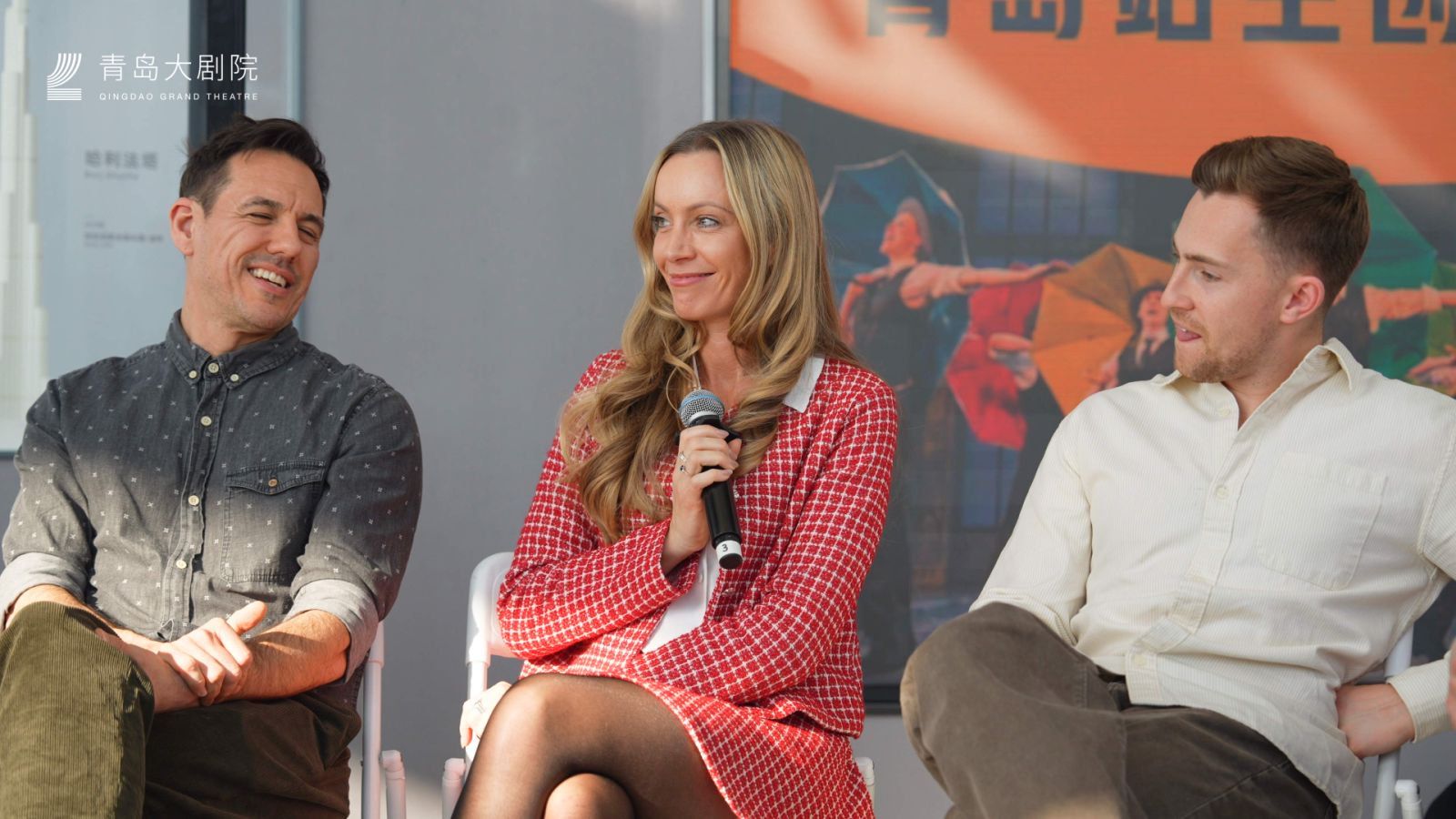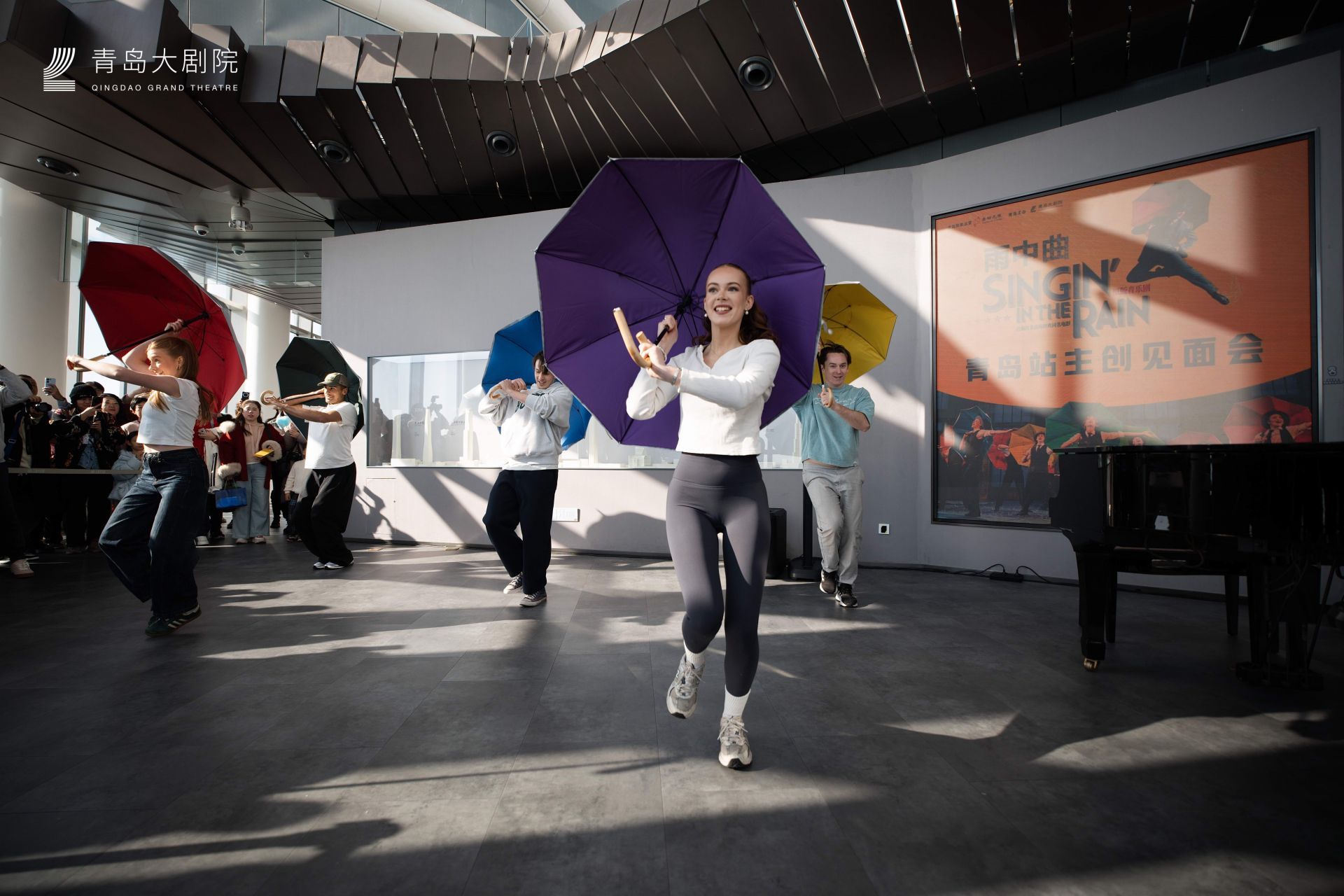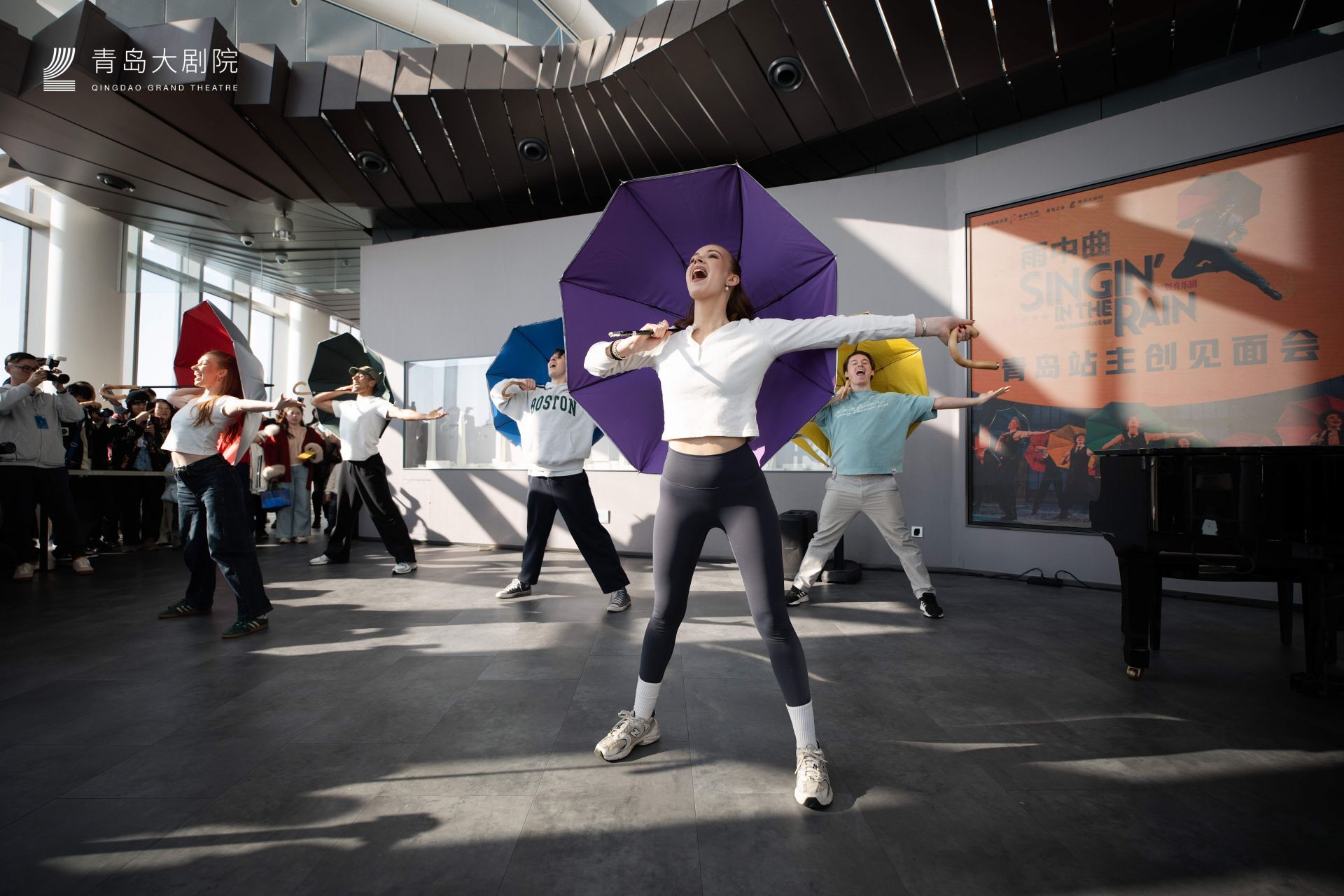 这是原版音乐剧《雨中曲》青岛站巡演的特别预热活动。包括该剧四位主演、音乐总监及驻团导演在内的核心主创悉数到场。简短而精彩的舞蹈快闪后,主创们与现场观众亲切互动,分享音乐剧台前幕后的创作故事,并现场献唱《早安》《逗他们笑》及同名主题曲《雨中曲》等经典唱段。碧海蓝天为幕,轻快的踢踏舞节奏与窗外壮阔的城市海岸线相映成趣,引得现场游客纷纷举起手机记录下这一难得的“高光时刻”。