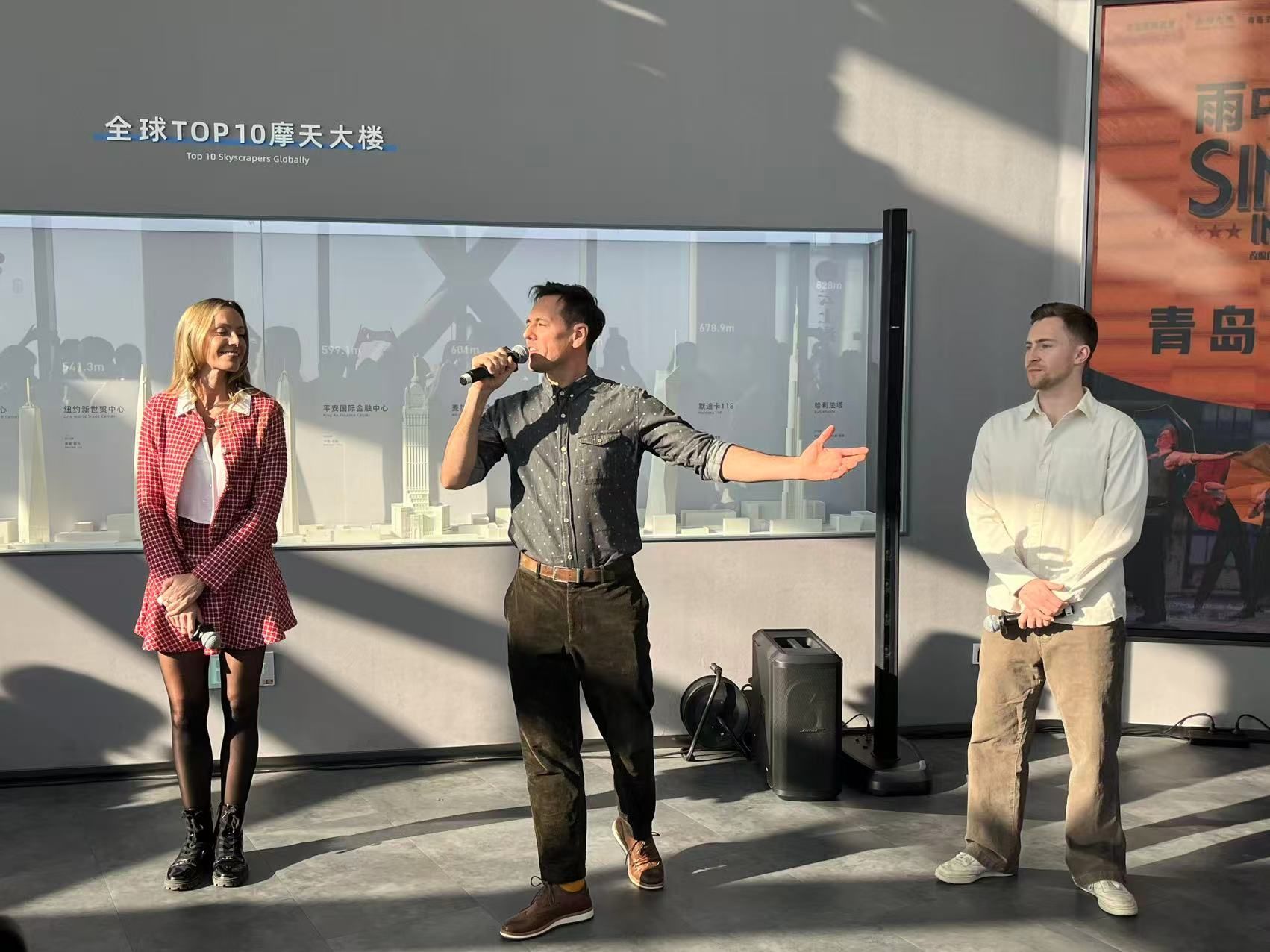 2月18日下午,一场别开生面的“云端见面会”在青岛海天中心81层城市观光厅精彩上演。伴随着经典旋律《Singin' in the Rain》的响起,伦敦西区原版音乐剧《雨中曲》的主创团队惊喜现身,在369米的青岛“新高度”上,用一场充满好莱坞黄金时代风情的快闪行动,为岛城新春增添了一抹国际化的艺术亮色。