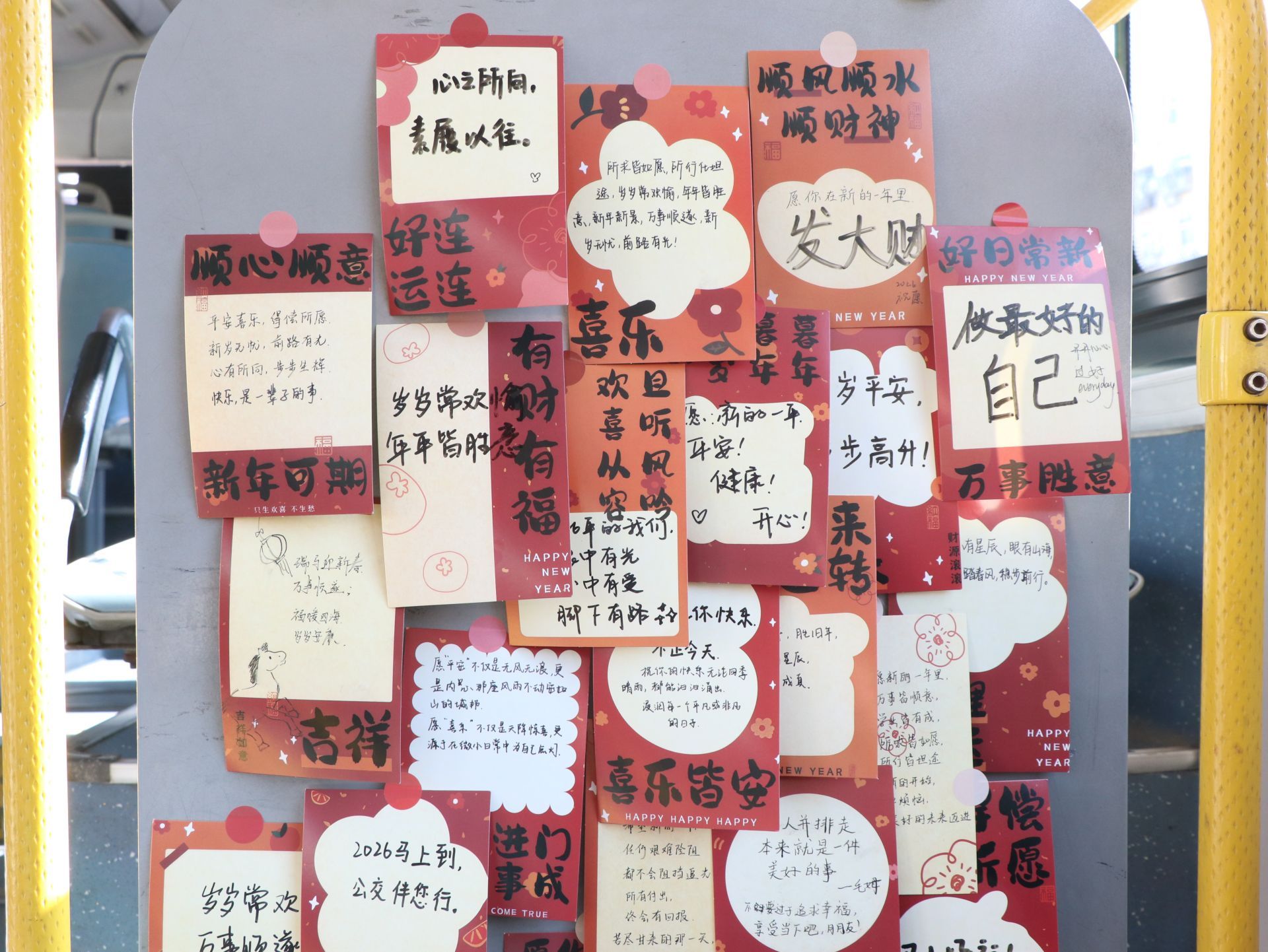 更特别的是,董述飞还在车厢一角设置了“马年心愿墙”。他准备了喜庆精致的便利贴,邀请乘客们写下新春寄语。学生们写下“金榜题名”,上班族贴上“马上有钱”,老年乘客一笔一划描下“阖家安康”。不一会儿,心愿墙便贴满了卡片,成为十米车厢里最治愈的风景。