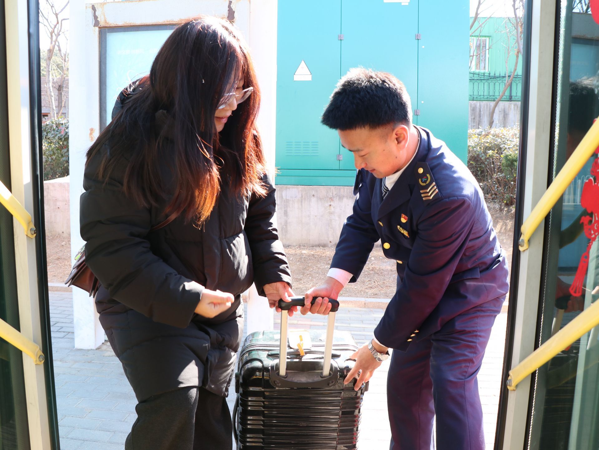 “春节客流密集,安全是头等大事。”董述飞说。他手中的检查记录本,密密麻麻写满每日车况,连一颗松动的螺丝都不放过。发车前,他照例执行“车前十检”流程,酒驾吹气检测、钥匙领取、车厢设施检查、安全隐患排查……每一个环节,他都以军人特有的严谨细致对待,九年来从未懈怠。在他的车上,还有一个贴心的“应急便民包”,各类药品一应俱全,为奔波的旅途添了一份温情。