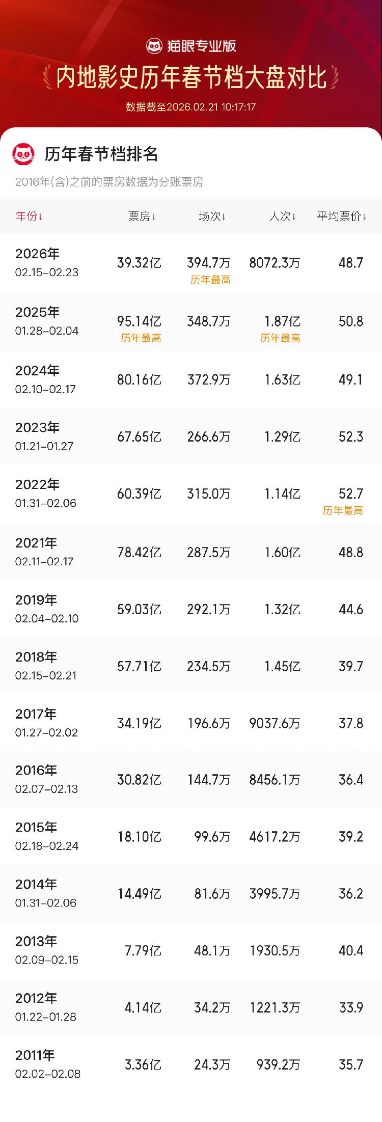 2026春节档总场次刷新影史纪录 2026-02-21 15:39 0 猫眼专业版数据显示,2026年春节档总场次超394.7万,刷新中国影史春节档总场次纪录,截至当前2026春节档总票房已达39.32亿。 来源:人民日报客户端 责任编辑:王海山