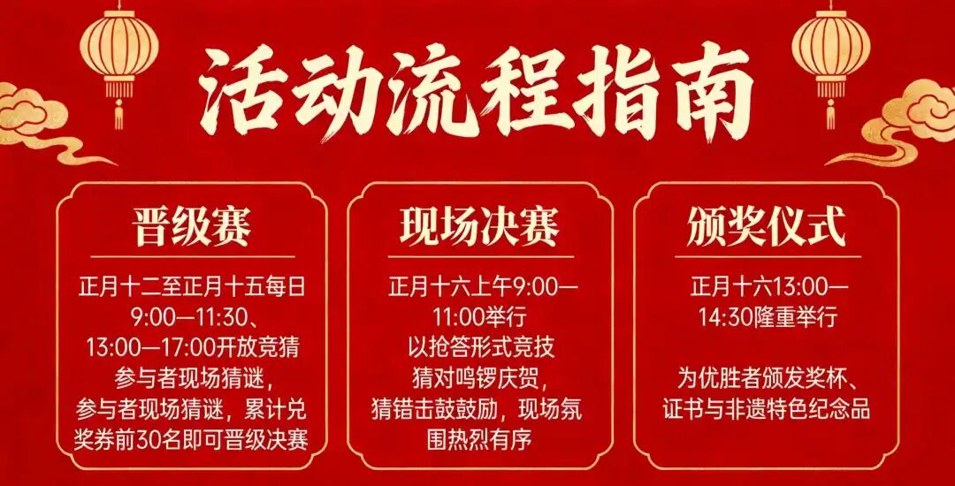 赛事分三阶段开展:正月十二至十五为积分晋级赛,每日9:00-11:30、13:00-17:00开放,市民现场猜谜积分,正月十五17:30前积分≥20分可获决赛资格;正月十六9:00-11:00举行决赛,资格选手抢答比拼,按成绩排名;当日13:00-14:30举办颁奖仪式,见证“射虎高手”荣耀。