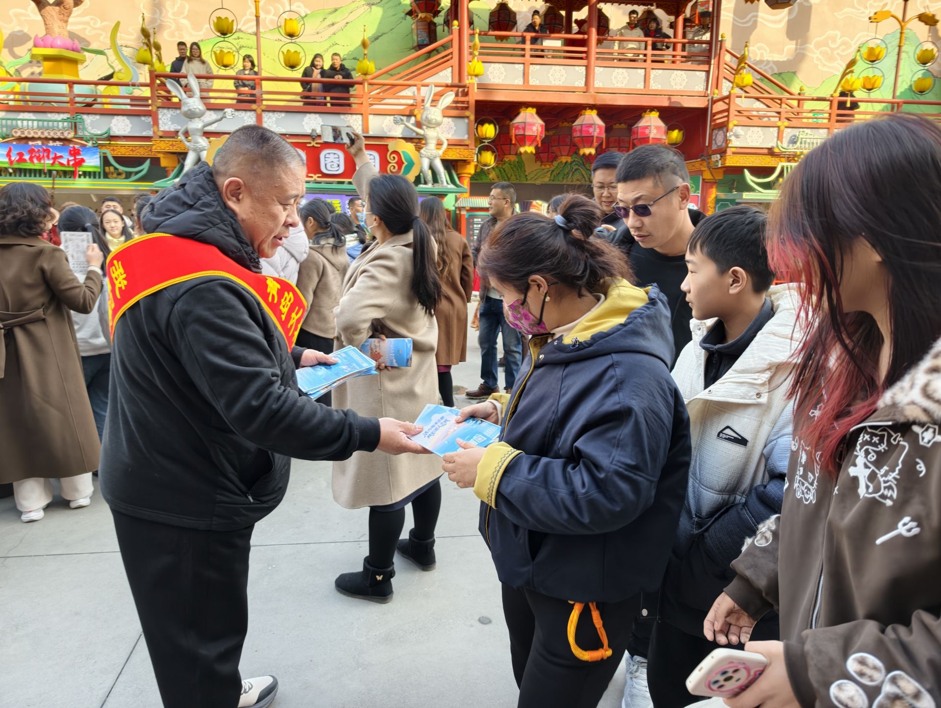 春节假期,焕新亮相的青岛山海间不夜城主题街区张灯结彩、人流如织。作为城阳区春节嘉年华的重要一站,这里处处洋溢着喜庆祥和的年味,熙熙攘攘的人群中,一场别开生面的快闪活动不期而至,文旅志愿者们穿梭其间,为游客送上新春旅行指南,传递着文明旅游理念,让新春的温暖触手可及。