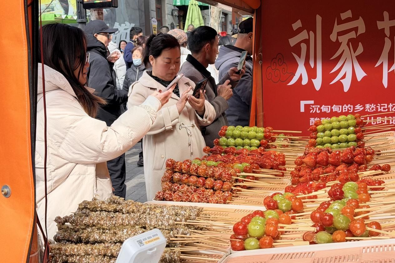 走进大鲍岛文化休闲街区,百年里院张灯结彩,新春装饰红红火火,处处洋溢着喜庆热闹的节日氛围。胶州路主轴市集摊位鳞次栉比,糖球、元宵、青萝卜、特色小吃香气四溢,老字号与网红美食同台亮相,高家糖球、李家糖球等招牌前长龙不断,山楂糖球、水果糖球、创意奶皮子糖球琳琅满目,市民游客手持糖球边走边尝,尽享舌尖上的年味。非遗糖画、剪纸、面塑摊位前围满观众,巧手匠人现场展演,让传统文化在烟火气中活态传承。