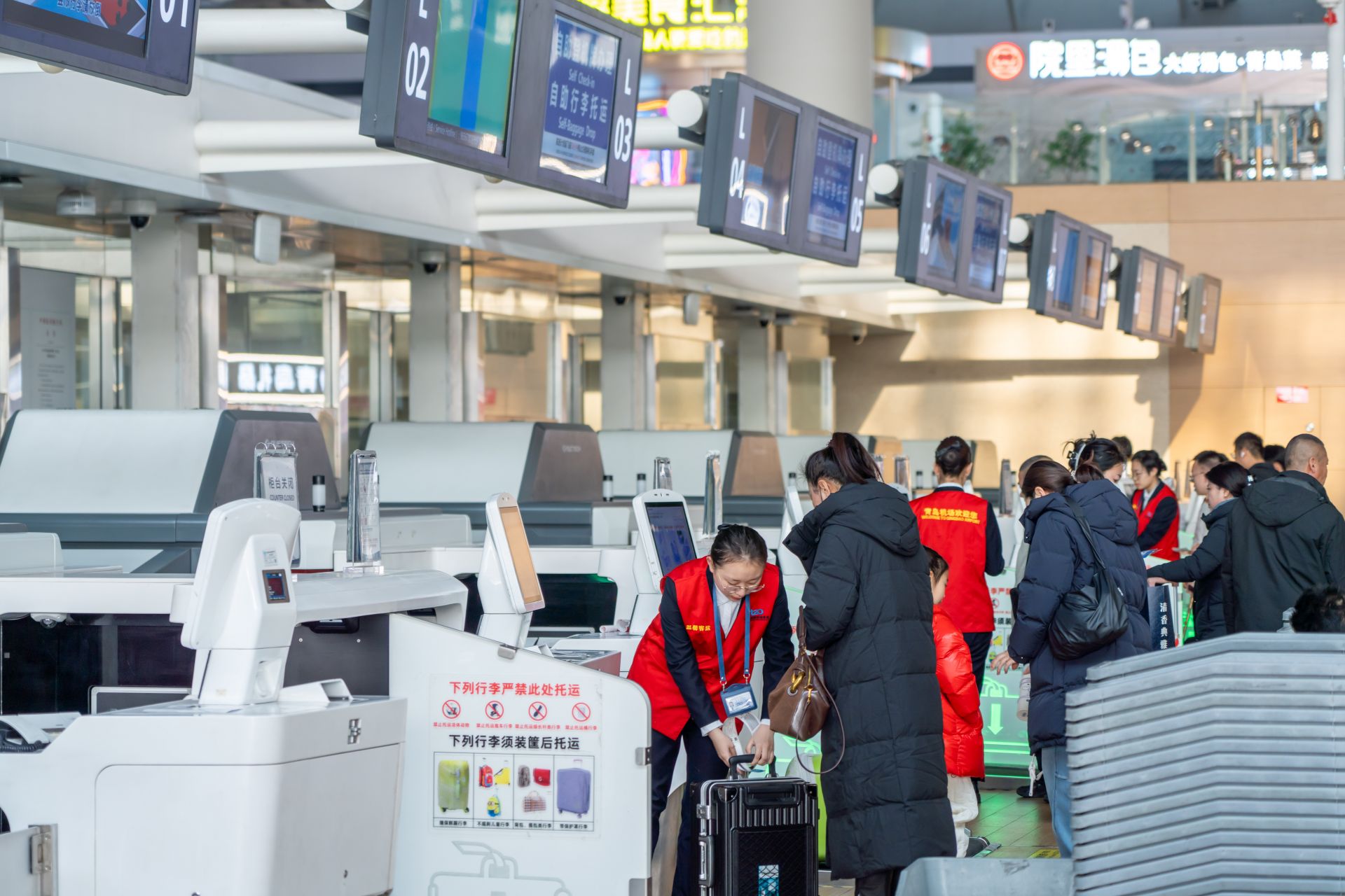 面对高位运行态势,青岛机场强化运行统筹和资源调配,动态优化值机、安检等保障力量,提升高峰时段通行效率。针对节日期间烟花爆竹、锂电池等禁限带物品增多的情况,加强岗位协同查控与专项培训,通过现场提示与互动宣传增强旅客安全意识,实现安全管控与服务引导同步推进。