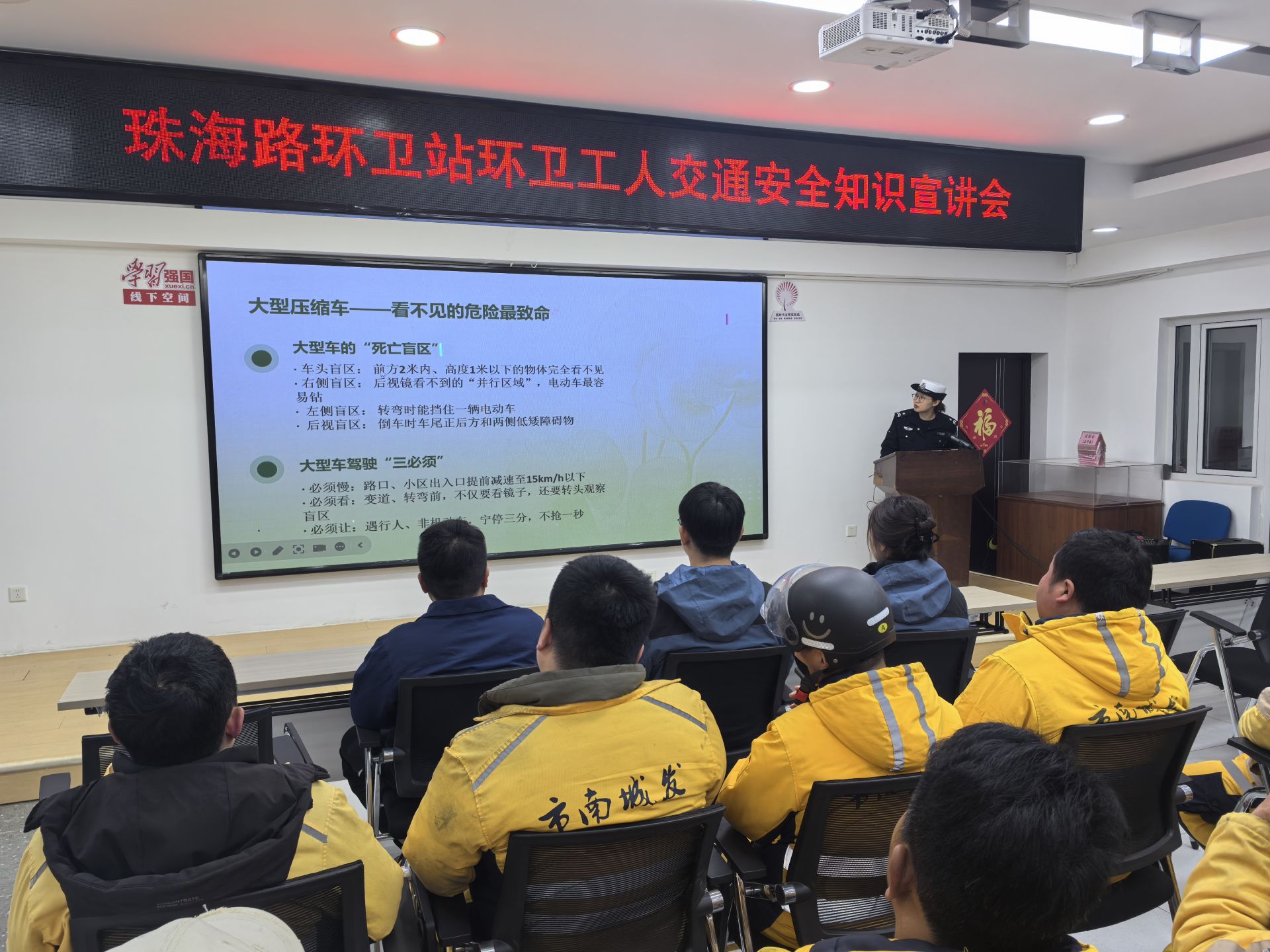 为提升广大企事业单位干部员工的交通安全意识,营造全民守法的良好氛围,市交管支队城区高架路大队、市南区大队、董胶高速公路大队、崂山区大队、黄岛区大队主动对接辖区企事业单位,将交通安全知识融入“开工第一课”。宣讲内容紧贴日常通勤场景,重点讲解驾乘人员规范使用安全带、驾乘电动车佩戴安全头盔、杜绝酒后驾驶及分心驾驶等核心要点。