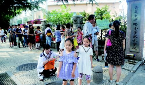 半岛全媒体记者 何毅 报道 青岛太平路小学门前,孩子们和家长在排队等候报名。