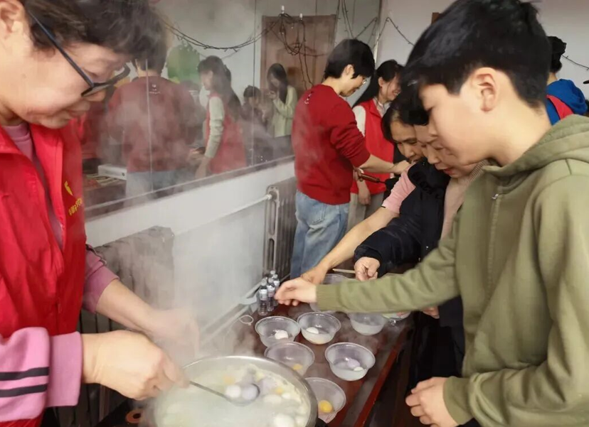 最暖的,当数那一锅热腾腾的汤圆。锅里热水翻腾,白胖的汤圆浮浮沉沉。志愿者将煮好的汤圆分装在小碗里,递到居民手中,一位阿姨接过汤圆笑着说:“真有过节的气氛。”