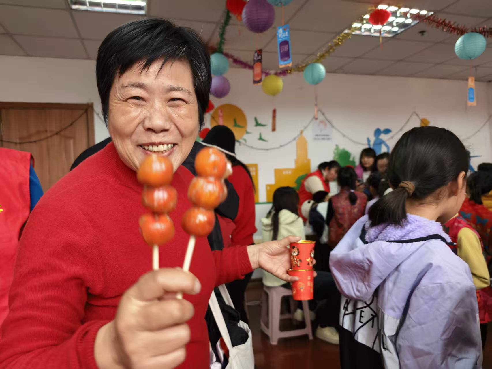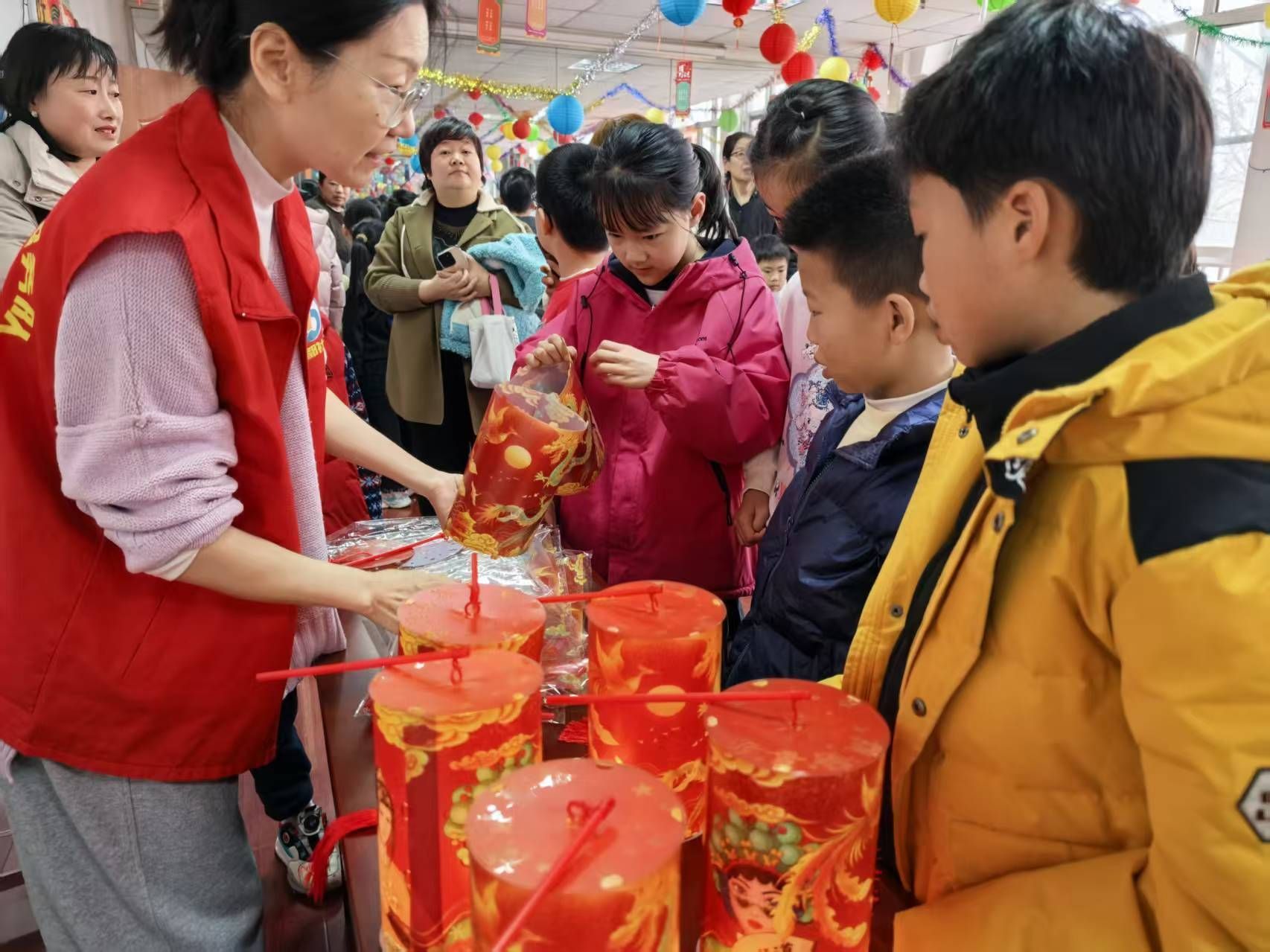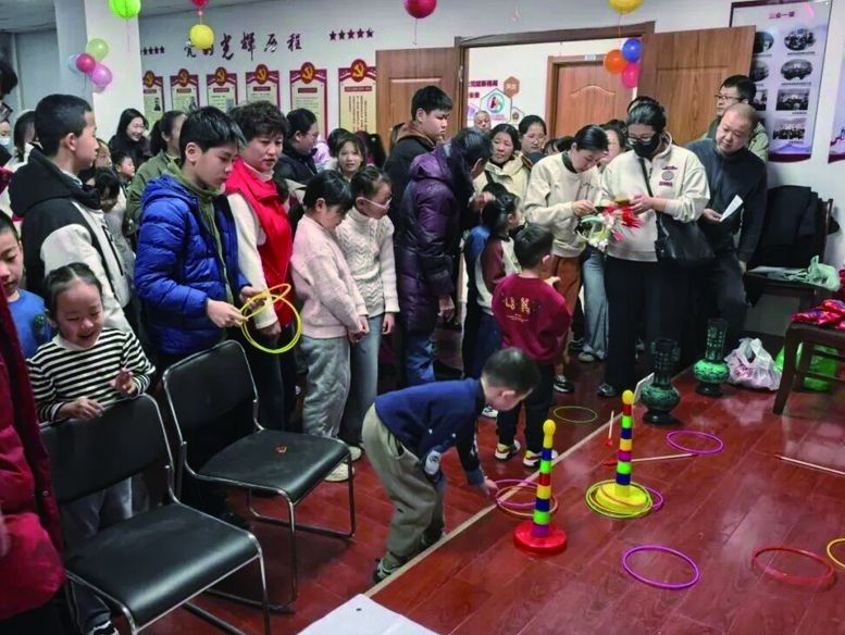 活动现场,不仅有社区工作者,还有身穿红马甲的党员志愿者和热心楼长。他们有的负责维持秩序,有的在煮汤圆分发给孩子们,有的则当起了“秩序引导员”,耐心地为孩子们讲解投壶和套圈的规则。