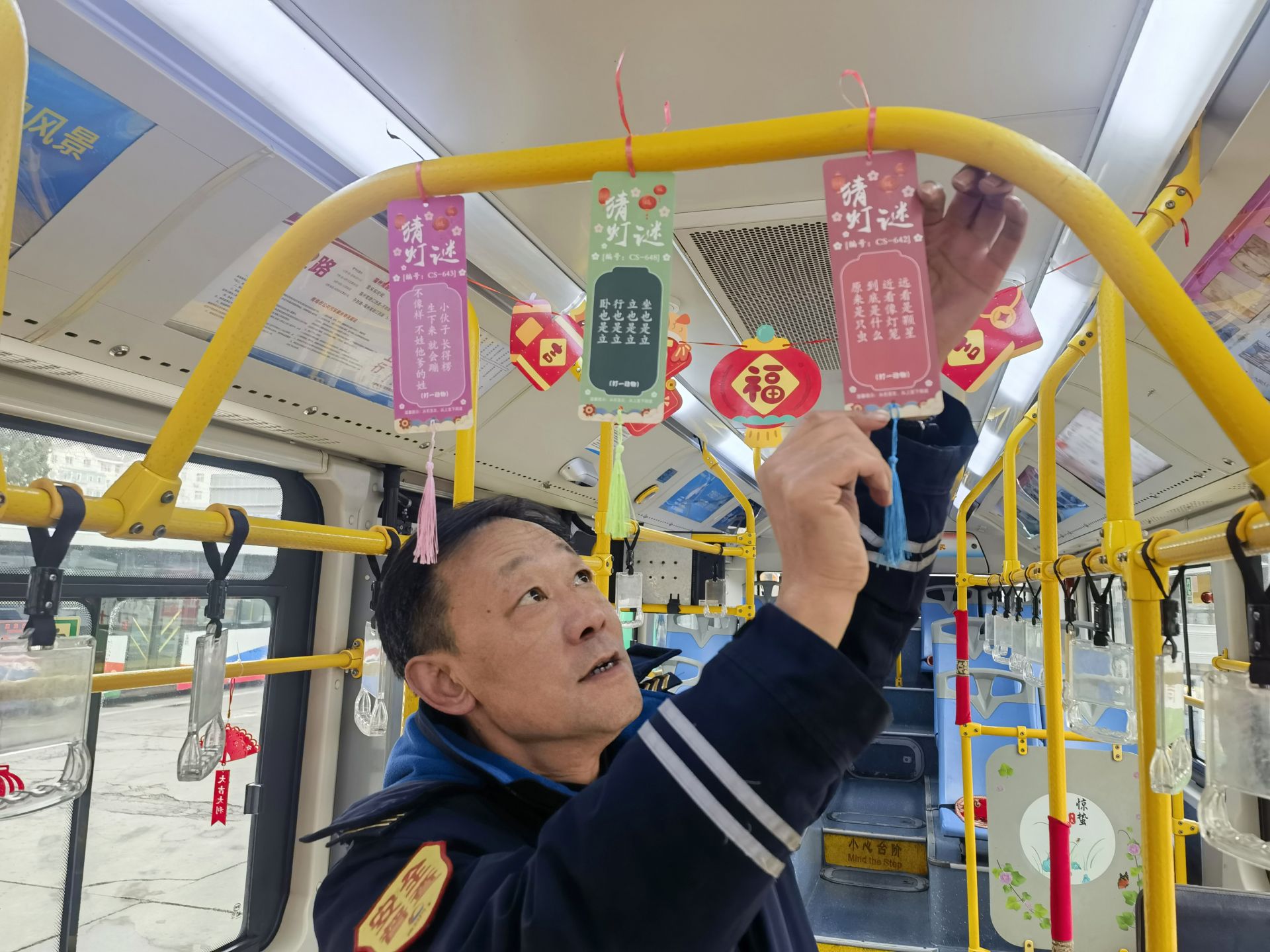 走进李滨驾驶的12路公交车,一股喜庆祥和的气息扑面而来。车厢顶部,一串串红彤彤的小灯笼错落有致地悬挂着,随着车辆的行驶轻轻摇曳,宛如一场流动的微型灯会;寓意吉祥的“元宝”挂件、色彩斑斓的福袋点缀其间,为车厢增添了灵动与趣味,让每一位踏上公交车的乘客都眼前一亮。
