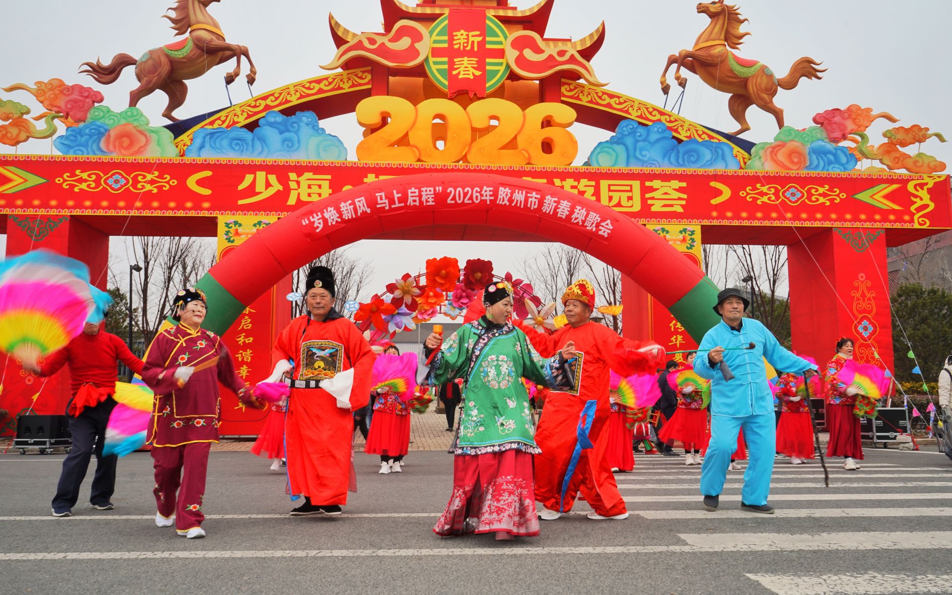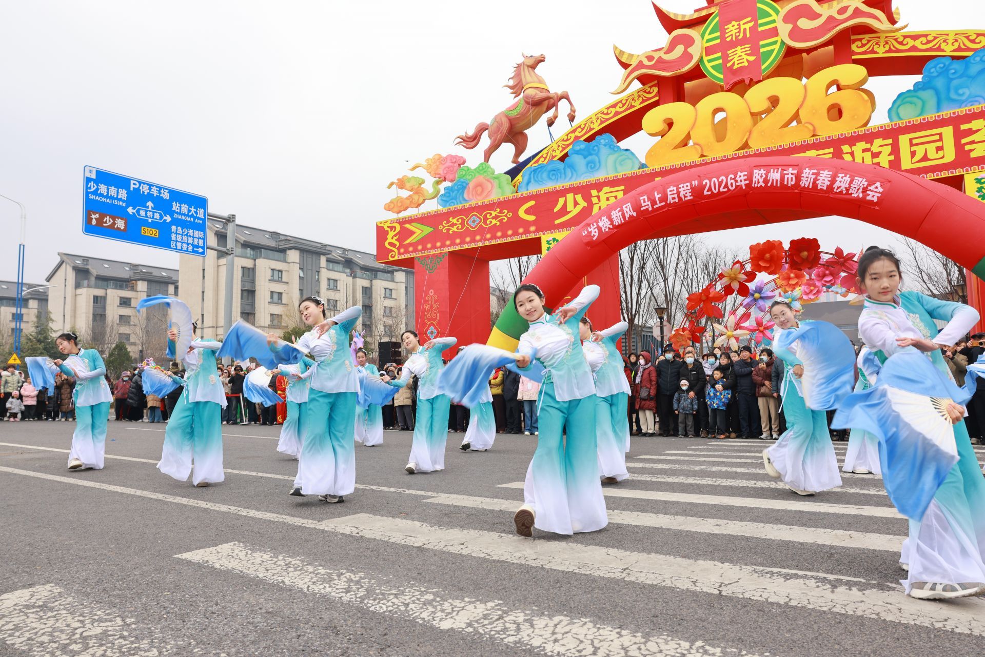 上午9时30分,板桥镇东南入口的“岁焕新风 马上启程”2026年胶州市新春秧歌会集中展演正式开始。作为“胶州秧歌之乡”的胶东街道,此次特意组织了2支传统胶州秧歌队伍亮相,73岁的国家级非遗传承人吴英民带着女儿与弟子们率先登场,男刚女柔“三弯九动十八态”的经典扭姿、鼓子滑稽幽默的神态,瞬间点燃现场气氛。30支优秀秧歌及民俗队伍轮番登场,鼓子刚劲、扇女柔美,高跷凌空、旱船摇曳,三百年胶州秧歌在元宵佳节扭出新时代的鲜活韵味,为市民游客奉上一场沉浸式的非遗文化盛宴。