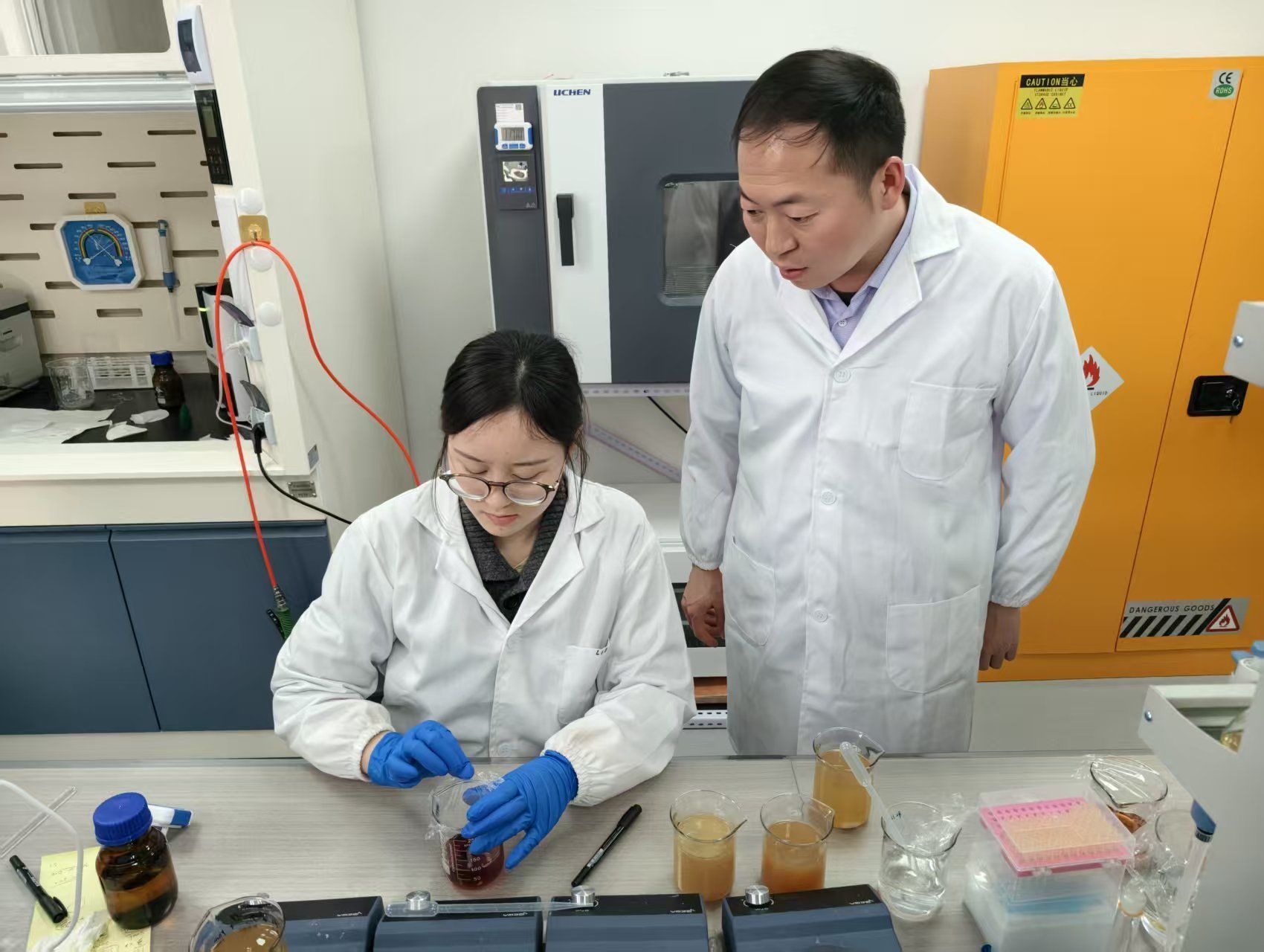 唐小斌指导团队成员做试验。