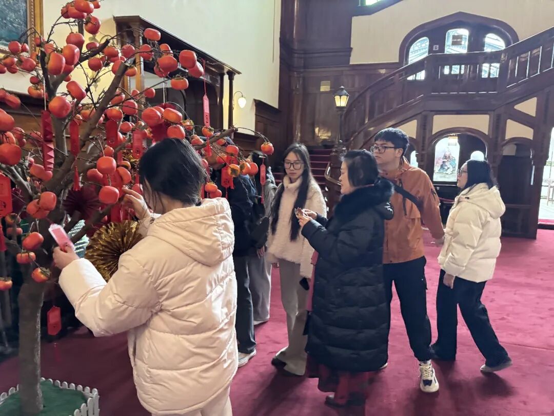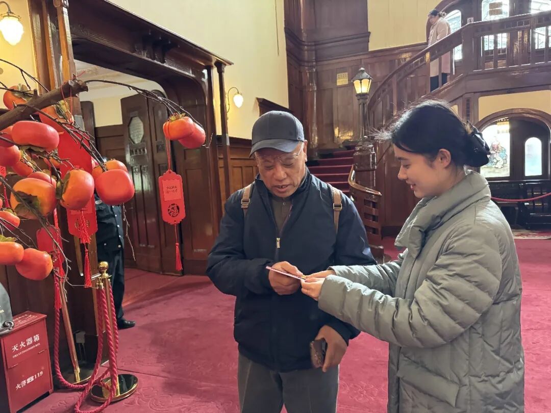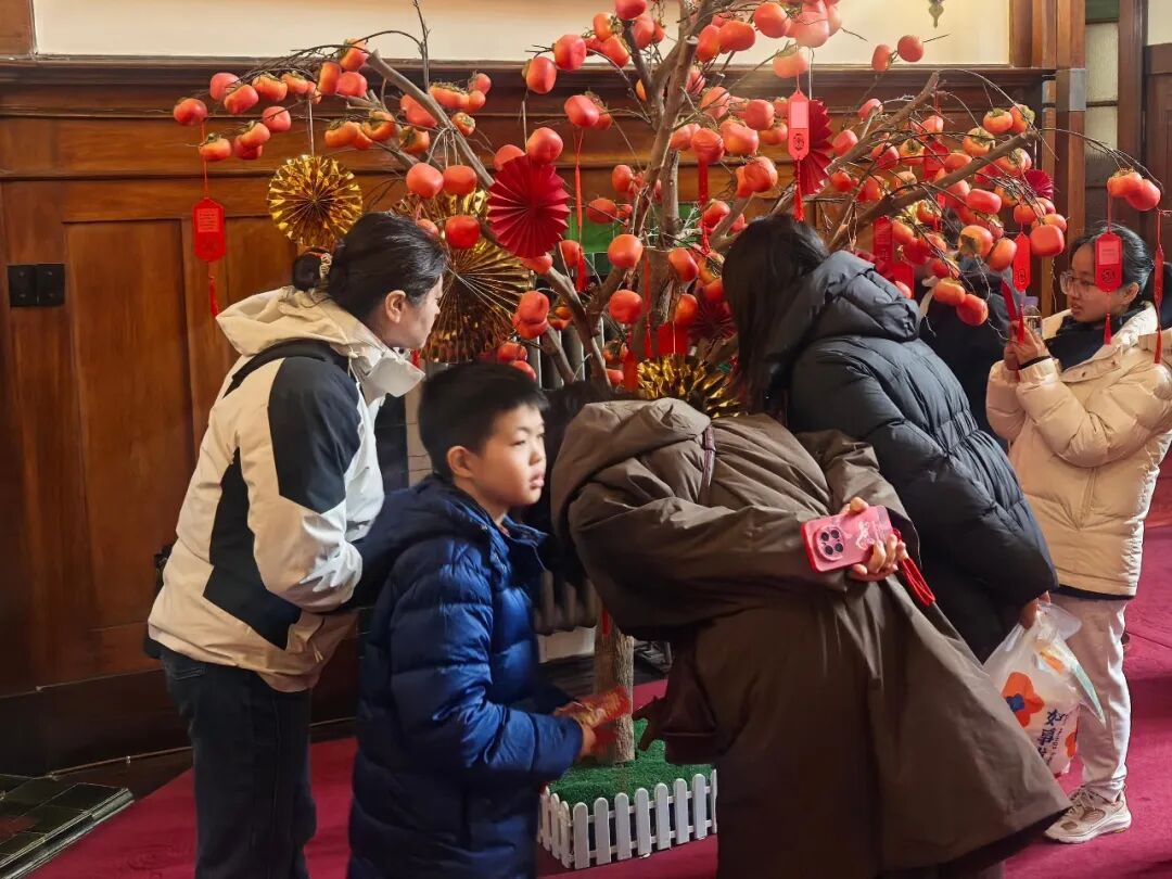 本次灯谜竞猜活动选址博物馆中央大厅,现场精心布置“柿柿如意”仿真柿子树,红彤彤的柿子造型搭配挂满枝头的谜语福牌,营造出喜庆祥和的元宵氛围。数十条灯谜内容丰富、趣味十足,吸引了众多游客驻足思索、踊跃参与,大家或独自揣摩谜底,或结伴讨论交流,欢声笑语萦绕在百年建筑中,为古朴的博物馆增添了浓浓年味与生机。