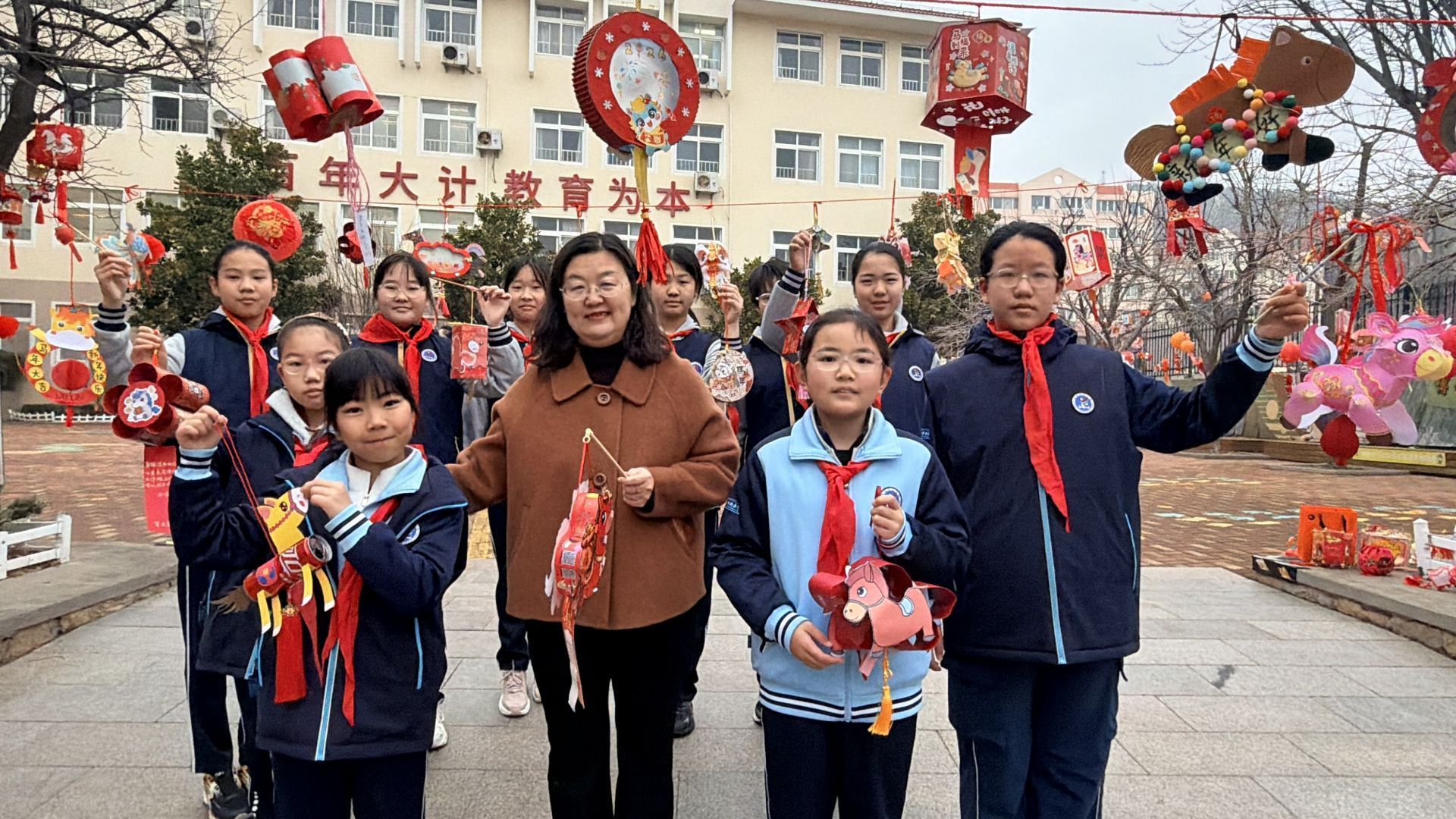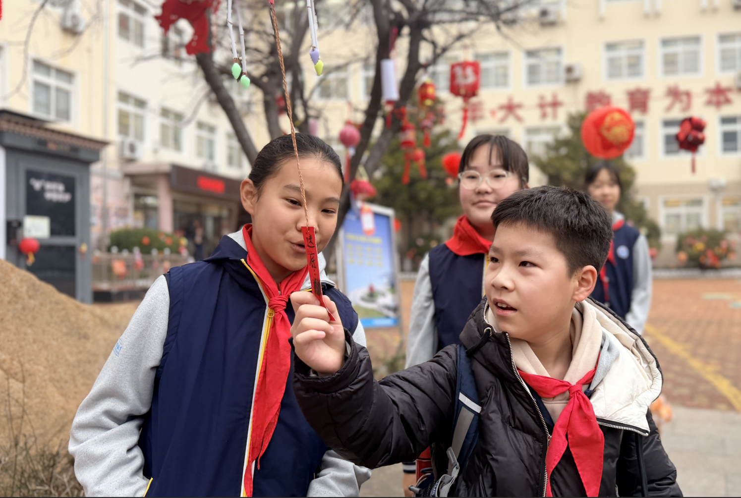 清晨,青岛天山小学门口红灯高挂,喜庆的灯笼将校园装点得格外热闹,学校领导干部早早在校门口迎接返校学子。现场趣味猜灯谜环节更添欢乐,同学们围在灯谜前认真思索、踊跃抢答,在欢声笑语中开启新学期的美好篇章。