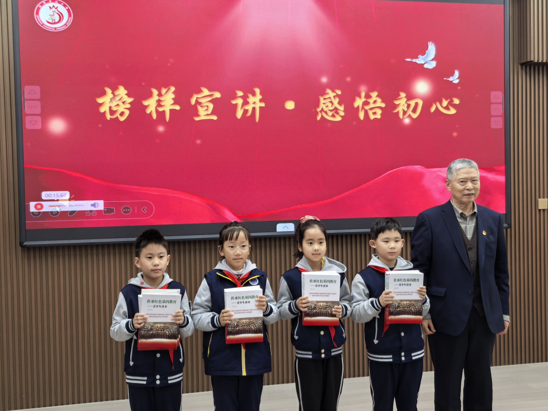 活动特别邀请青岛市劳动模范、海尔集团原党委副书记、青岛市红色文化研究会红色基因研究顾问王安喜结合鲜活事迹,为同学们讲述雷锋精神,诠释雷锋精神的时代内涵,让红色精神根植童心。同时,王爷爷为学校捐赠了《传承红色基因教育——青少年读本》,让红色书香浸润校园,为学子成长注入红色动力,让传承红色基因、关心下一代的种子在同学们心中生根发芽。