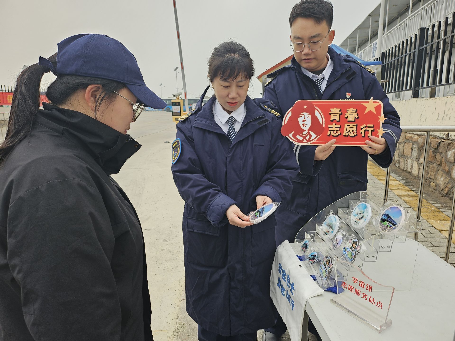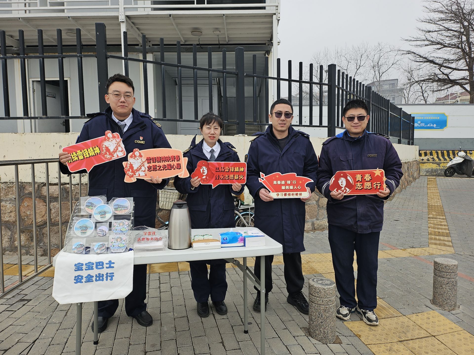 在场站服务点,志愿者们设立了“学雷锋志愿服务站点”,为过往市民提供便民服务。他们向乘客发放印有雷锋精神宣传语的文创产品,讲解公交出行安全知识,用贴心的服务传递温暖。此外,志愿者们还在站点引导乘客有序乘车,维护场站秩序,用实际行动诠释“公交为民”的服务理念。