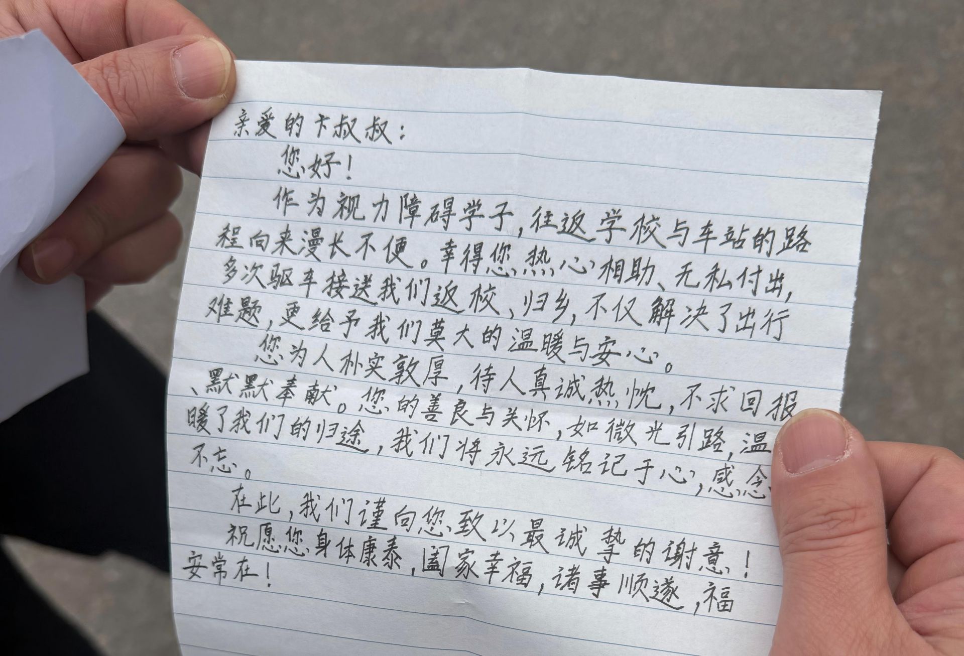 下午4时许,卞涛父子的车稳稳地停在青岛市盲校门口。杜同学下车前,摸索着从包里拿出一封感谢信,递给卞涛,轻声说:“卞叔叔,竣宁哥哥,下学期见。”