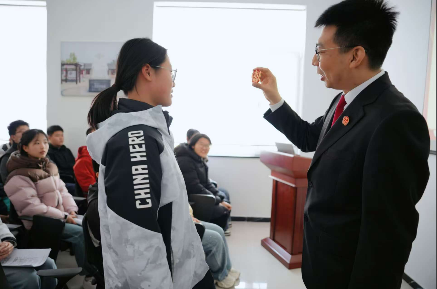 参观结束后,一场精彩的普法小课堂在法庭内开讲。“大家看,法徽上的图案是什么?”“没错,是代表公平正义的天平,法官胸佩法徽,就是要时刻提醒自己,把公平正义放在离心脏最近的地方。”法院干警围绕法徽、法袍、法槌的深刻寓意与具体用途进行细致讲解,并对即将开展的模拟法庭活动进行简要介绍和角色分工,学生们认真聆听、踊跃互动,现场气氛热烈。