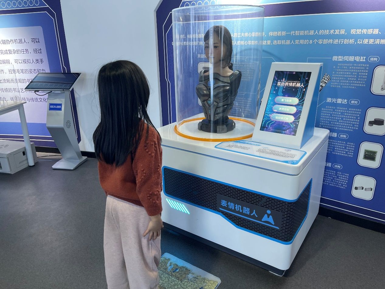 科技馆的姜老师为小记者进行了讲解。而此次研学之旅的最大惊喜,莫过于科技馆新亮相的人工智能展品。表情机器人成为现场的“人气王”,该展品由带有假发的硅胶头部组成,逼真的硅胶皮肤质感十足,先进的表情控制系统不仅能单独控制五官动作,还预设了喜、怒、哀、乐、惊讶等五种以上表情。小记者对着机器人摆表情,机器人都能精准捕捉并同步模拟,趣味十足的互动让大家直呼“太神奇了”。