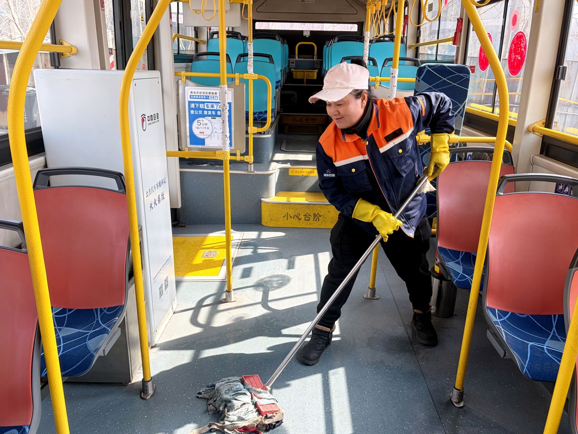 为了攻克车厢卫生死角,她和同事们变废为宝,自主研发了“万物皆可擦”五件套自制工具——竹竿布条擦、钢管布条擦、钢管拖把等五件神器,分别针对缝隙、高处、夹缝、座椅、座位周边等难清洁区域,件件精准实用,既减轻了工作强度,又大幅提升清洁效率与质量,让每一辆公交车都干净整洁、温馨舒适。