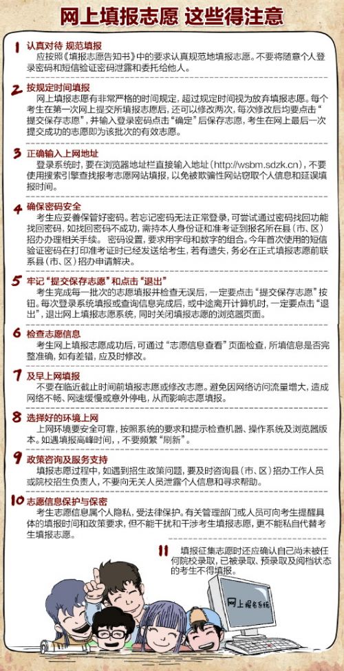 根据今年省考试院高考工作统一安排,6月28日填报夏季高考艺术类本科提前批、文理类本科提前批首次志愿,高水平运动员志愿,春季高考本科提前录取志愿,民航飞行技术本科专业志愿。具体填报时间为6月28日9:00~17:00。填报志愿网址为:http://wsbm.sdzk.cn。