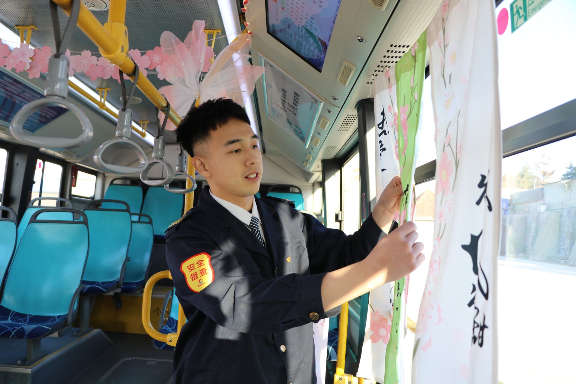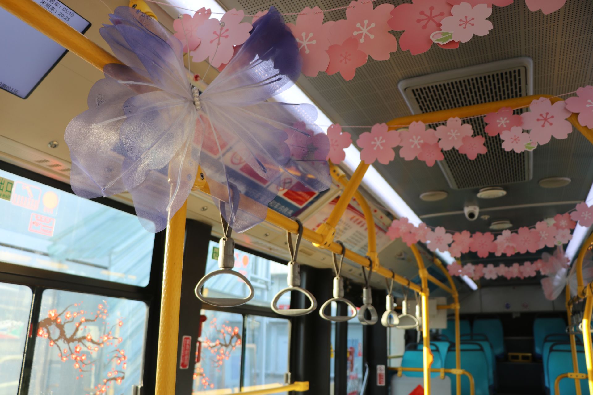 为了让乘客从上车那一刻起就沉浸于梅花节的美好氛围,213路驾驶员江世纪在DD1832号车厢精心打造“‘梅’景如画”主题车厢。车窗上张贴着梅花主题窗贴,扶手杆间点缀着栩栩如生的仿真梅花,车厢内仿佛移动的梅园,让乘客在行车途中提前感受梅花绽放。