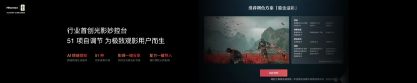 玲珑真彩背光作为海信专为RGB-Mini LED定制的光学系统,完成了光源、光型、阵列、算法的四重重构,从物理源头奠定了画质优势。海信E7SPro搭载的全自研车规级高光效RGB发光芯片,实现了三原色独立直出,无需量子点中间介质,轻松达成100%BT.2020原生色域,让屏幕还原出最接近大自然的真实色彩。海信E7SPro的玲珑真彩背光系统拥有7560控色分区与5100its超高亮度,实现了“1区控色>3 区控光”的行业突破,相较传统单色背光显示技术仅能控制亮暗,海信E7SPro可对每个分区的色彩与亮度进行独立精准调节,画面细节与色彩层次提升3倍以上。同时,通过微纳级匀光透镜与独创的RGB非对称光源旋转阵列,光晕降低60%,物理根除串色、偏色问题,即便在暗场字幕、高亮晚霞等复杂场景下,也能实现画面纯净通透无杂光。车规级的发光芯片,有效使用寿命突破16万小时,可稳定使用超过15年,彻底告别传统单色背光电视的色衰焦虑。